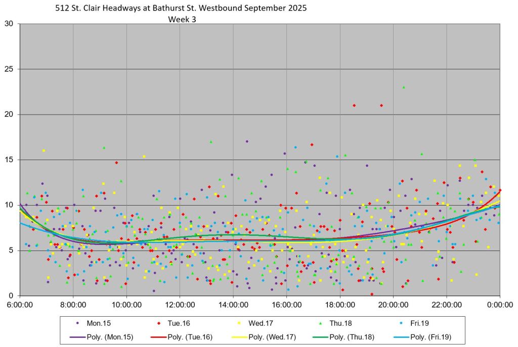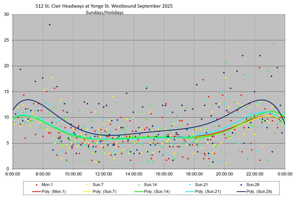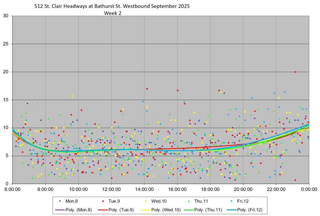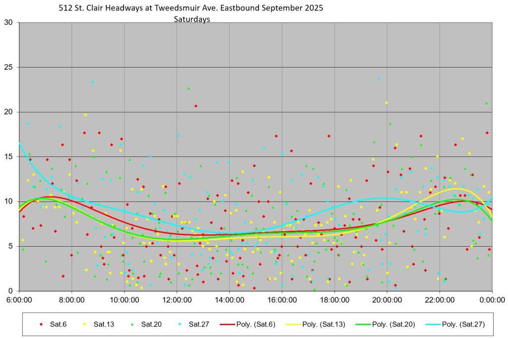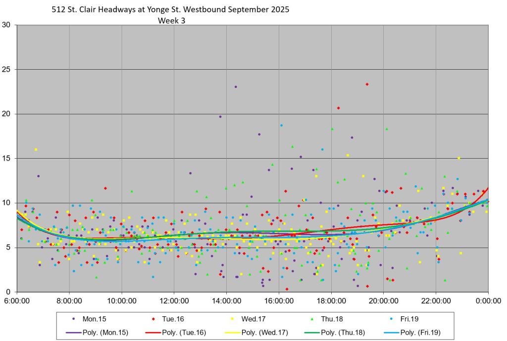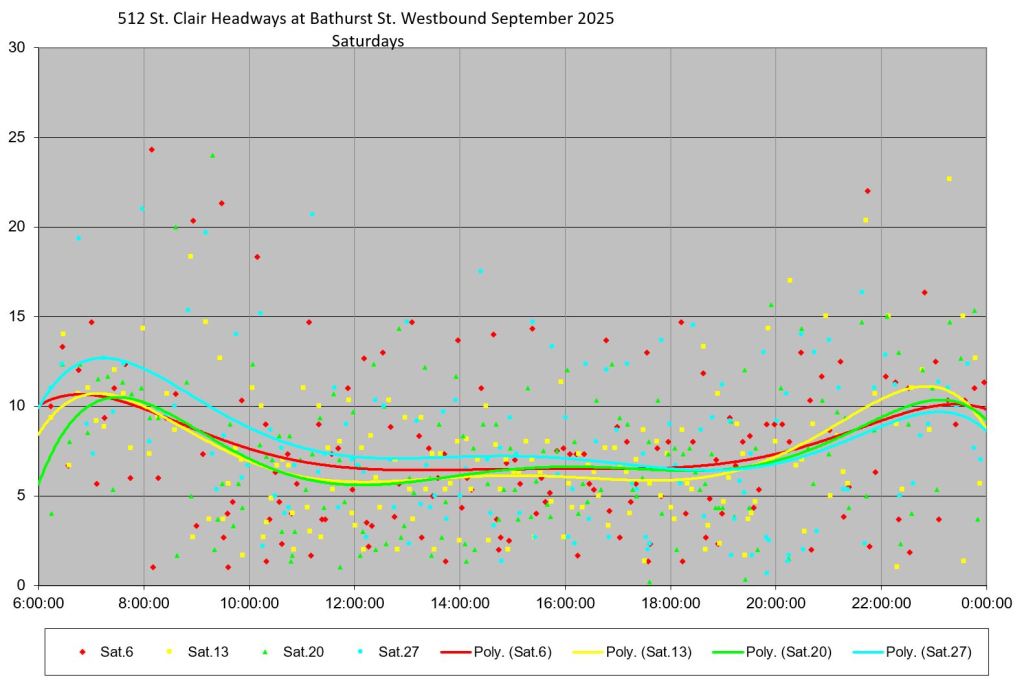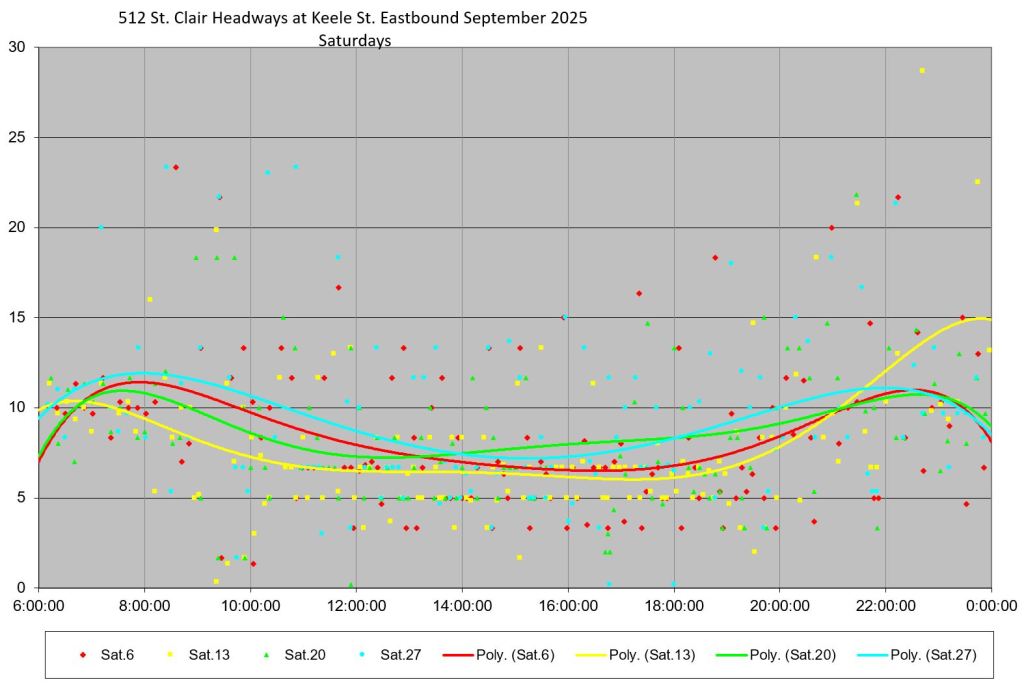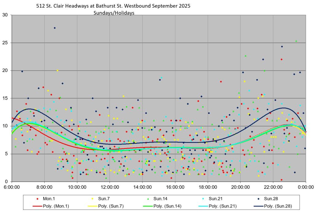 The 512 St. Clair car received improved service in September 2025, and this article updates the charts with headway stats to September 30 showing the combined effect of more service and route management.