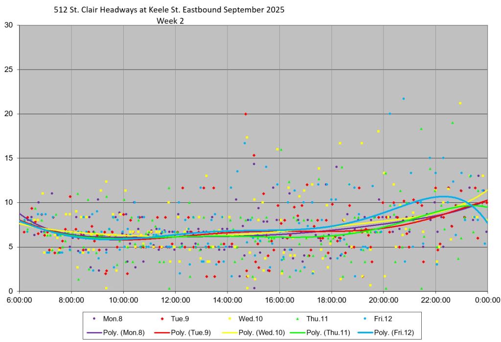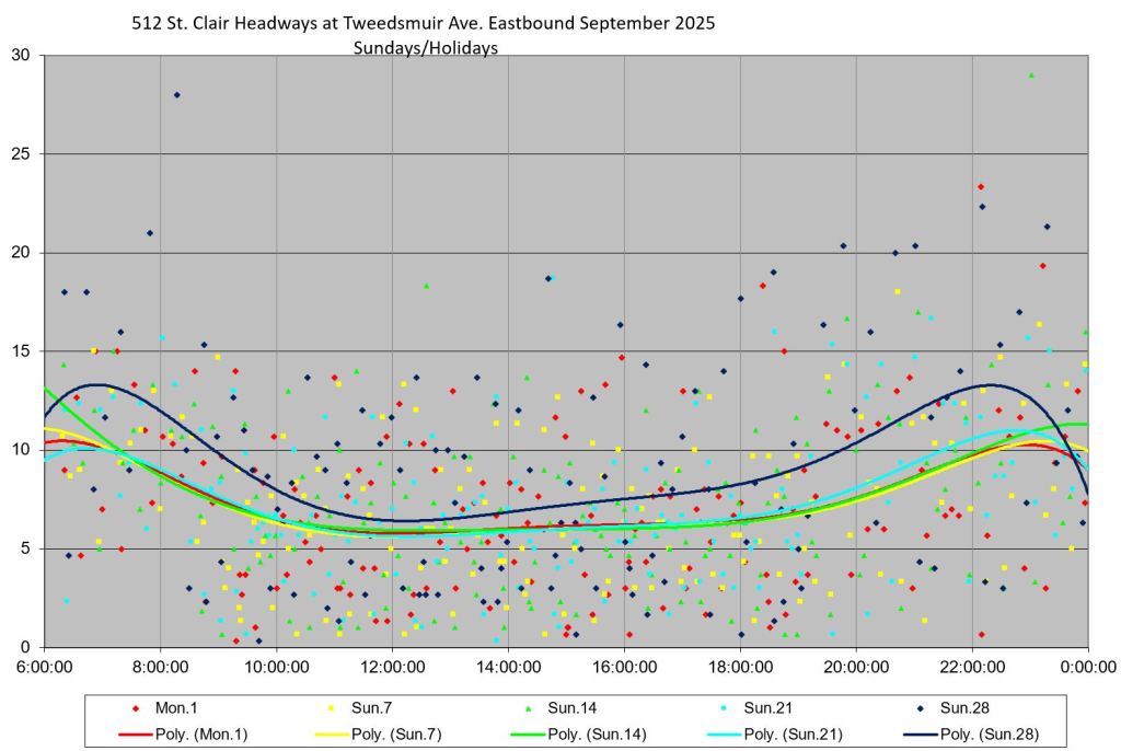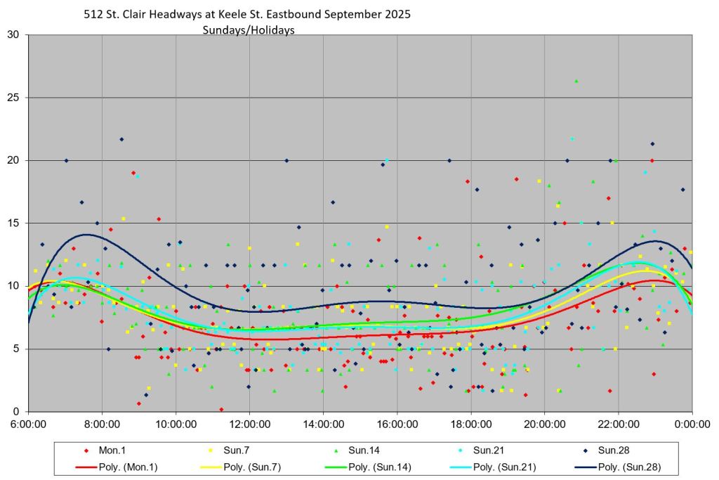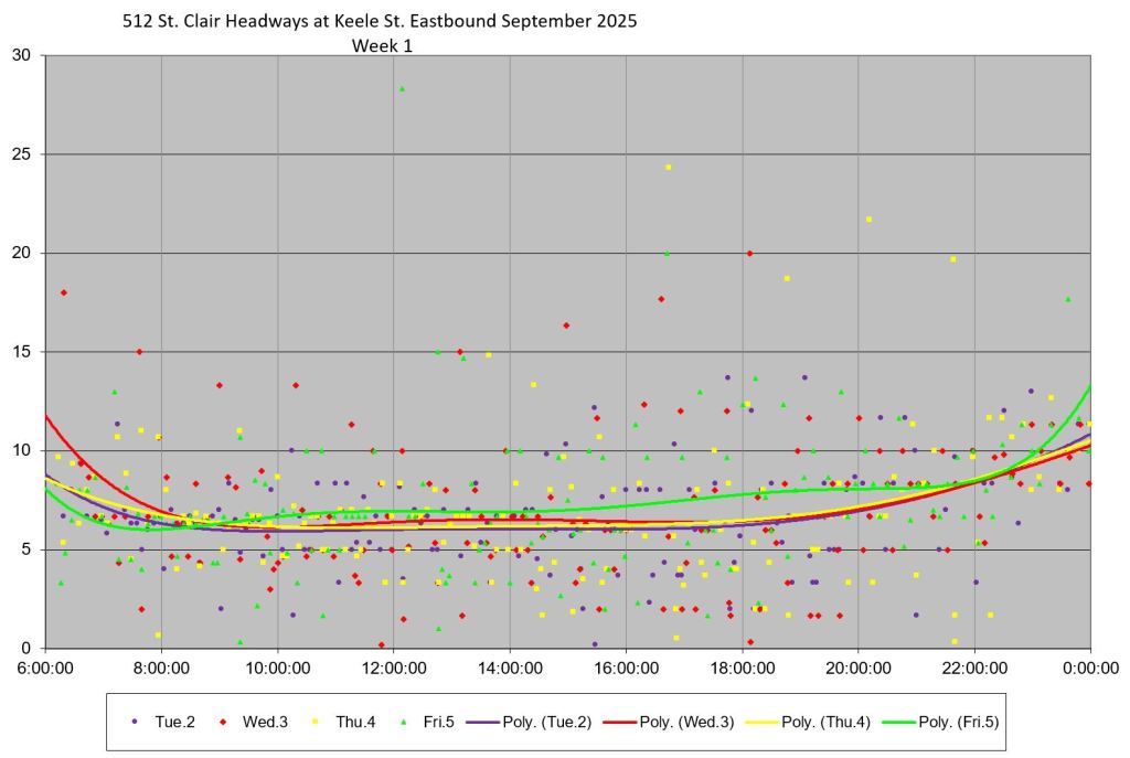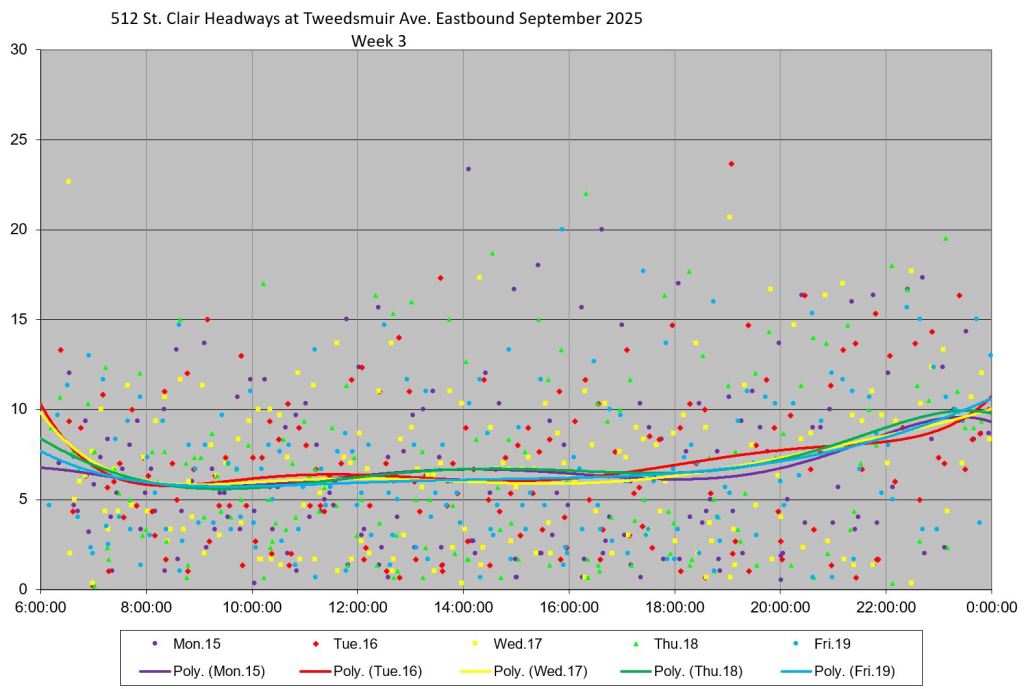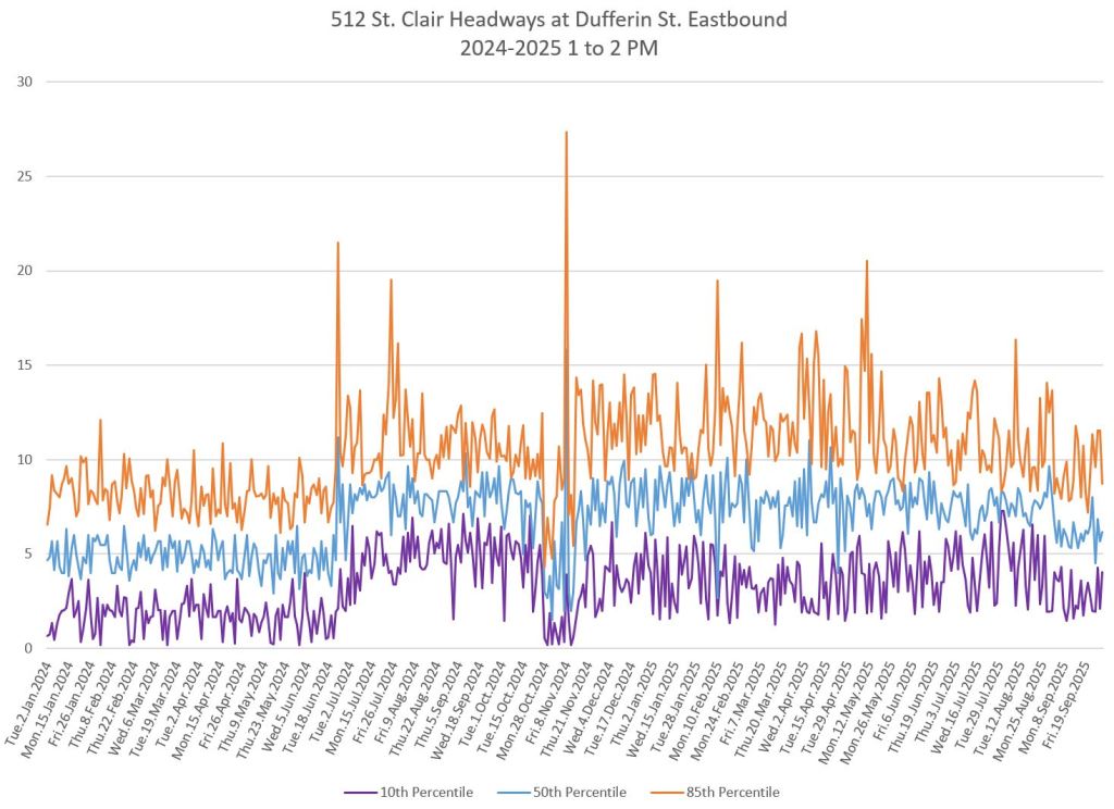 Generally speaking, the range of headways at various points on St. Clair did drop in September 2025, although the effect is more pronounced early in the month than later. Whether this indicates a trend away from tighter headway management as the month wore on will not be clear until more data have accumulated.