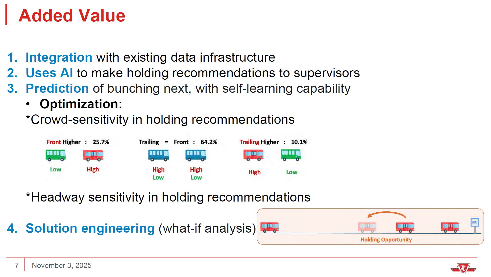 Because there is only one schedule design for a 46 minute trip time all day, the scheduled speeds are the same for all trips. An obvious question is whether the TTC will force cars to hold to this schedule even if it proves excessive thereby delaying riders needlessly. Conversely, if cars operate at whatever speed conditions will allow, there will likely be terminal congestion just as on streetcar routes with excessive scheduled travel and recovery times.