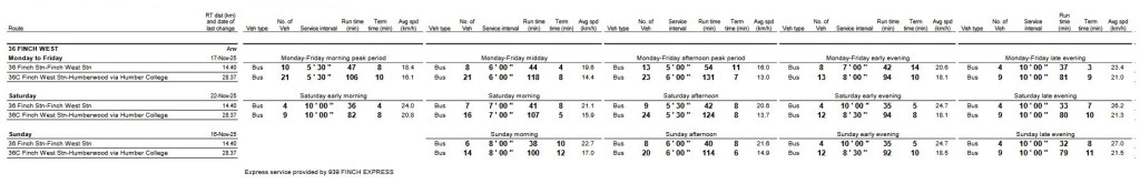 The average speed is slower than the 36 Finch bus during some periods, a rather poor showing for a rail line on its own reserved lane. In a future update, I will include more information about the stop level schedules and speeds for the 36C Finch West Bus. Here is the current scheduled service summary.