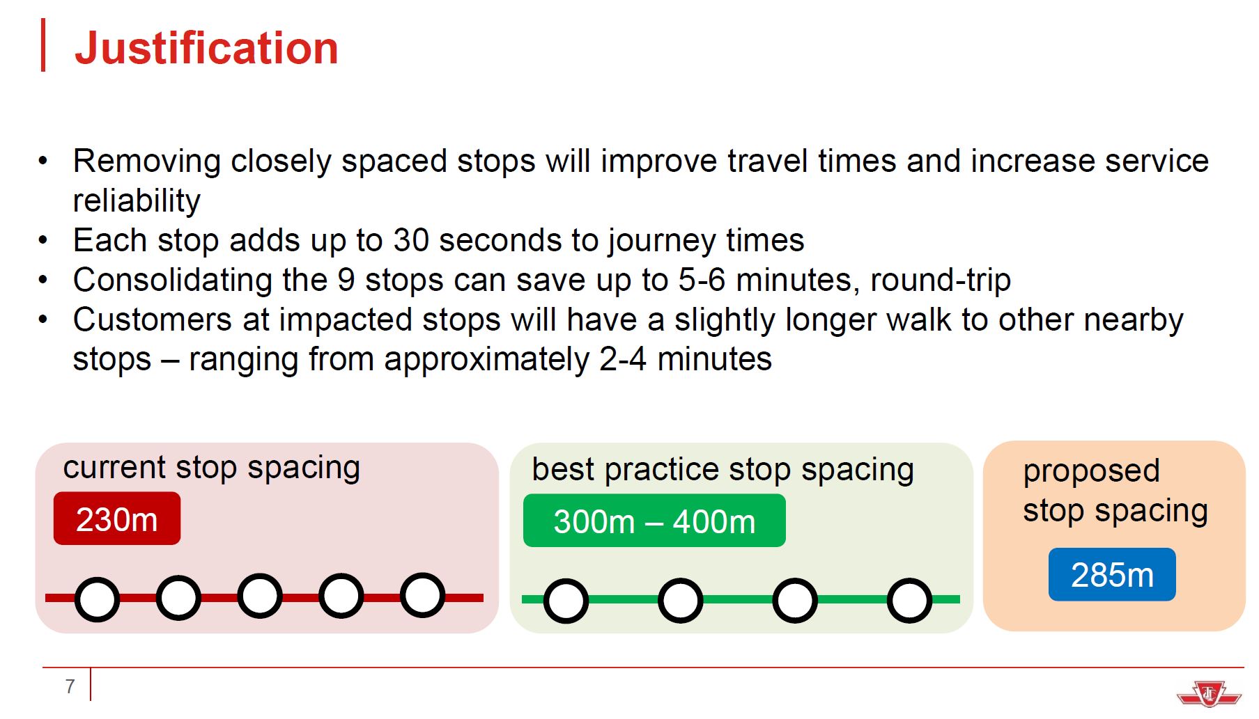 In the community presentation, the TTC cites the change in average stop spacing, but the Service Standard applies to individual stops.