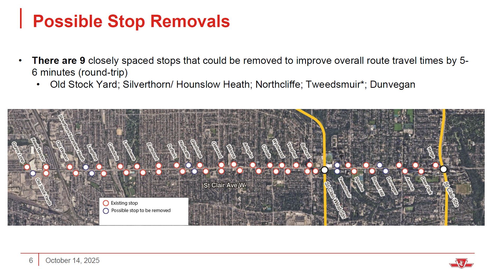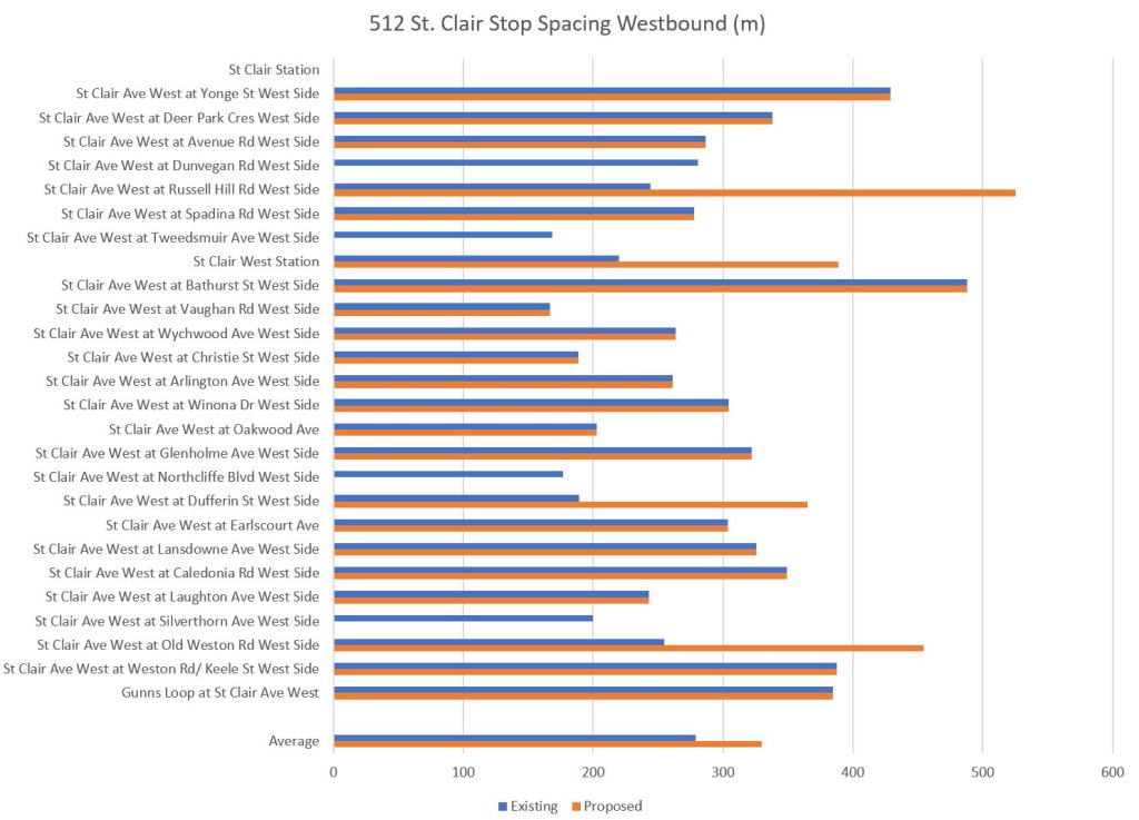 I’m curious about the source of the stop spacings. Using Google Maps’ measure distance tool, the midpoint of St Clair West Station to the eastbound side of St Clair and Spadina is 435 metres, while your data show it as nearly 600m. Perhaps they are counting a full lap of the station in the distances, which does not reflect the real world experience. I think Tweedsmuir is a slam dunk removal.
