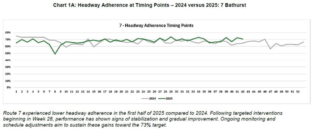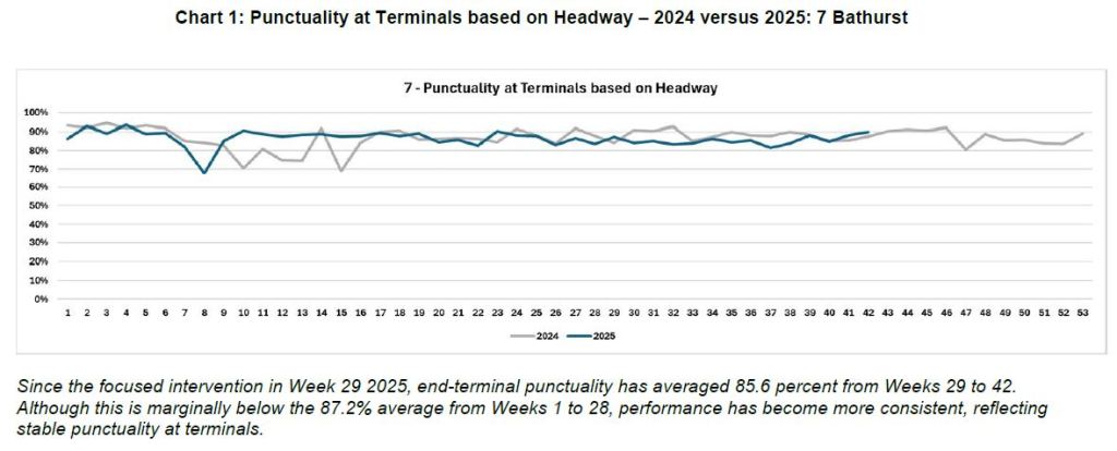 - 7 Bathurst: Delays from parked cars, left turns, school traffic, with mitigations including vehicle spacing, additional vehicles, on-street and Transit Control Centre supervisor support, and left-turn restrictions.
