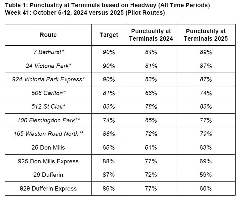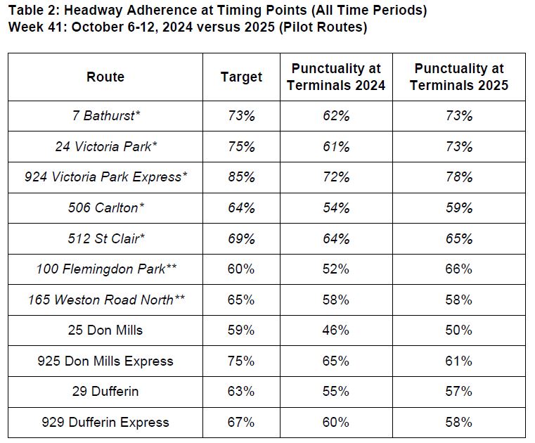 | March 2025 | Pilot launched on 7 Bathurst, 24 Victoria Park, 924 Victoria Park Express, 25 Don Mills, 925 Don Mills Express, 29 Dufferin, 929 Dufferin Express, 100 Flemington Park, 165 Weston Road North, 506 Carlton, 512 St Clair. Dedicated staff to manage each route were not used initially and results were poor. |