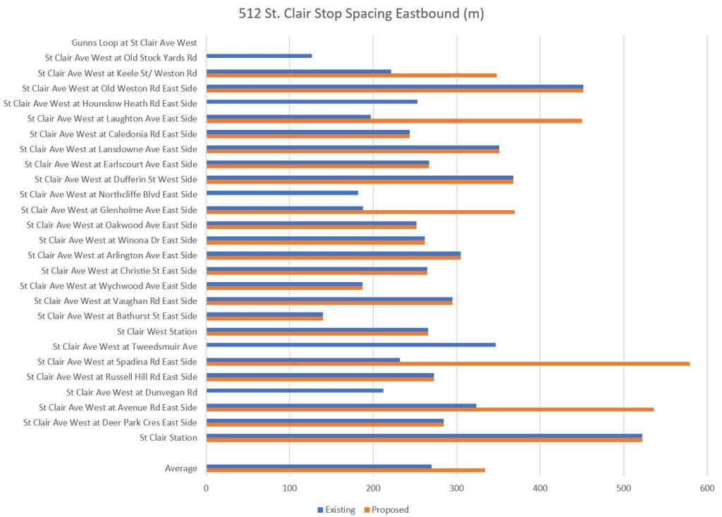 However, the term “closely spaced” does not align with the Service Standards because some of the resulting stop spacings are greater than 400m. The charts below show the existing (blue) and proposed (orange) stop spacings for each direction. Where a stop is eliminated, only a blue bar remains, and the orange bar at the next stop is correspondingly longer. (Stop data taken from the GTFS schedules for 512 St. Clair.)