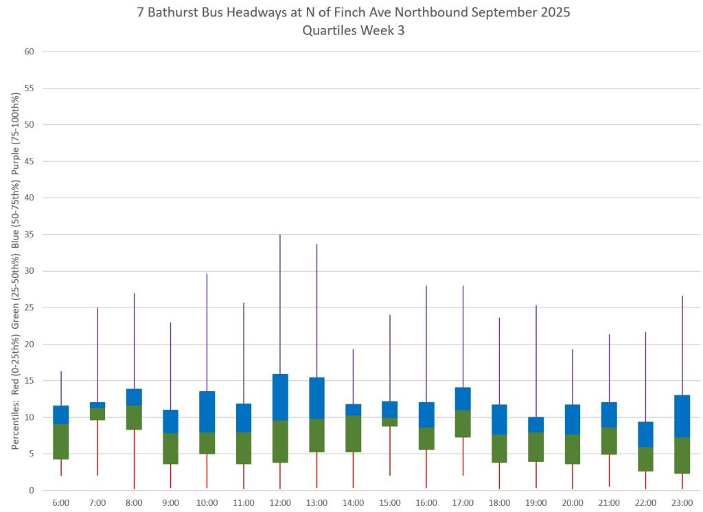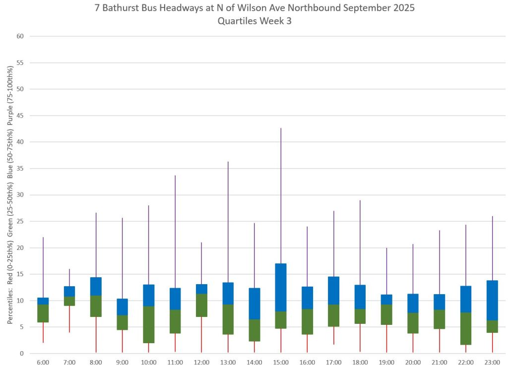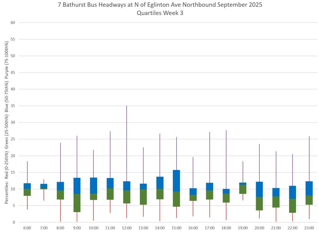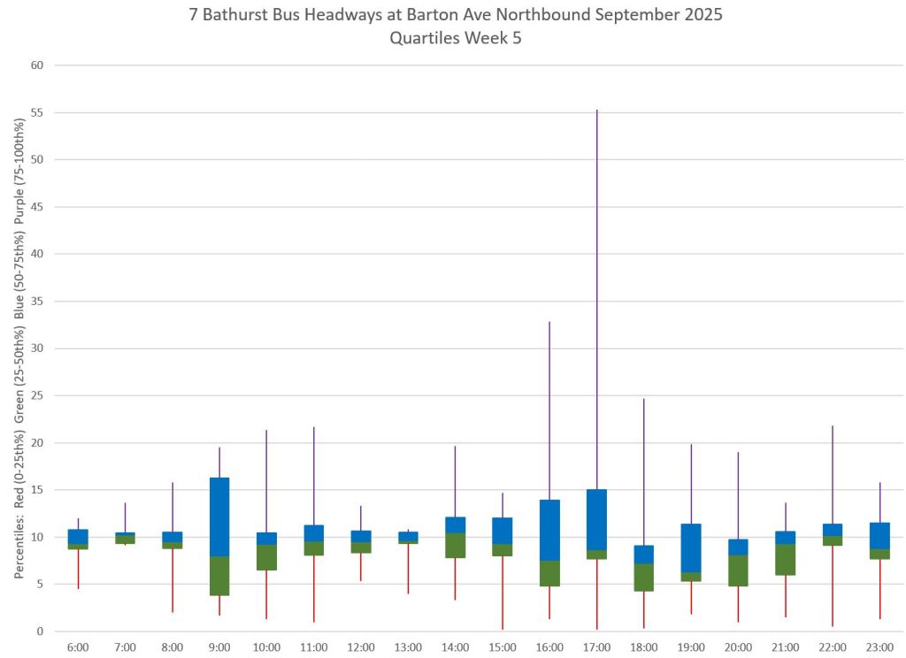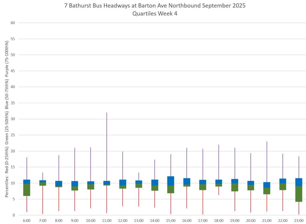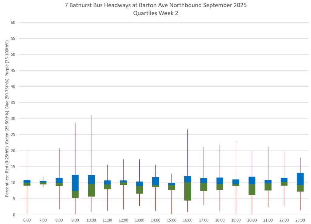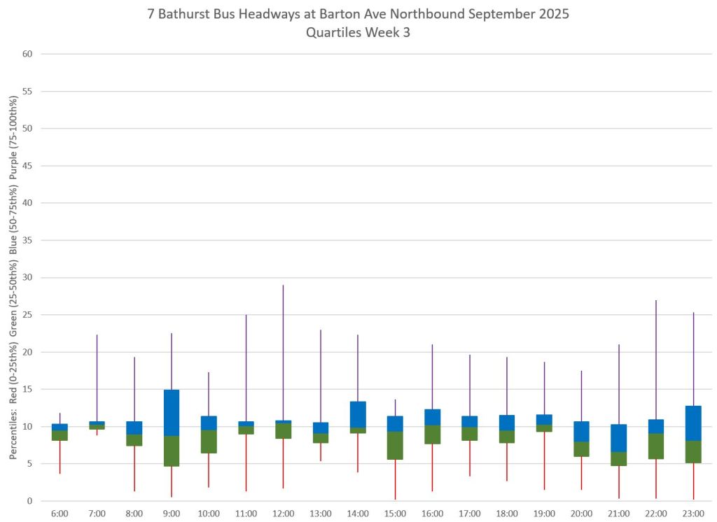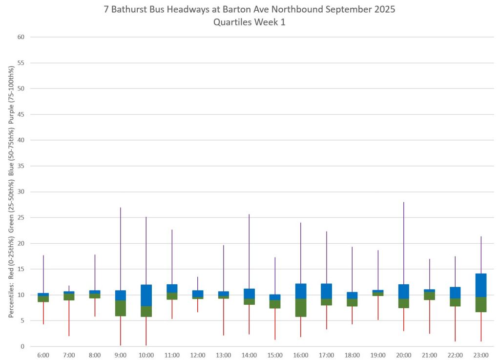 The charts in this section are in a format familiar to readers of service analyses on this site. They show the details of actual headways by time and day, as well as the range of values by quartile in September 2025. The location is at Barton Avenue, just north of Bathurst Station, showing the headway data for 7 Bathurst.