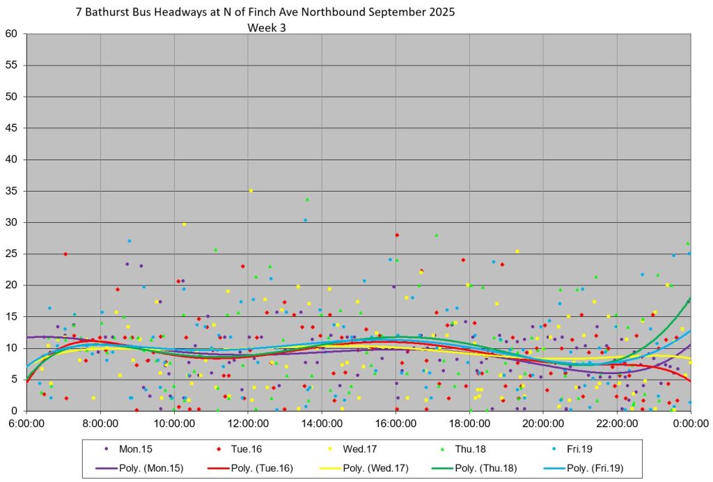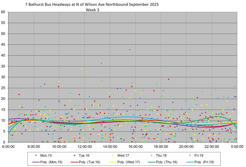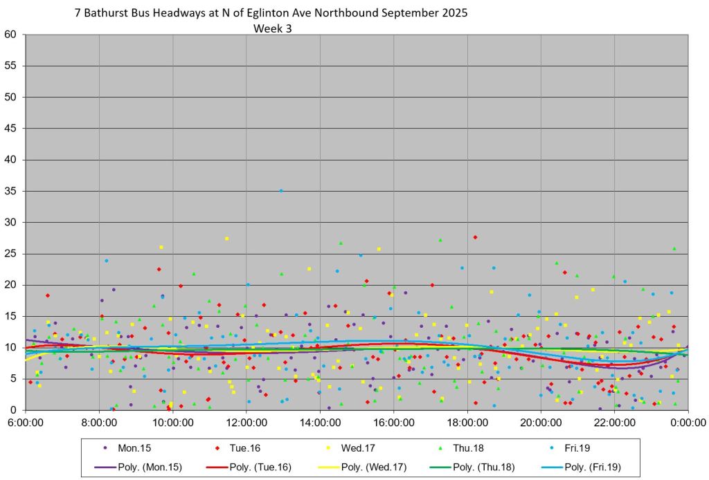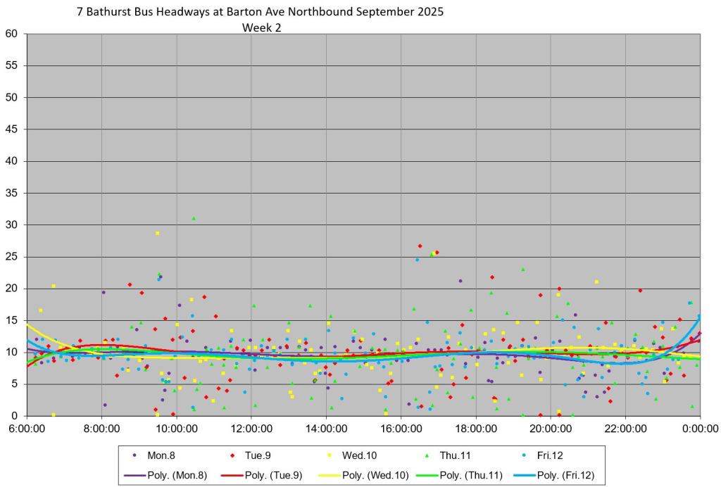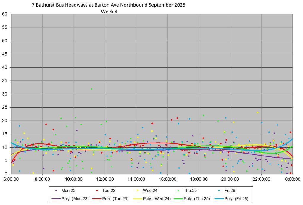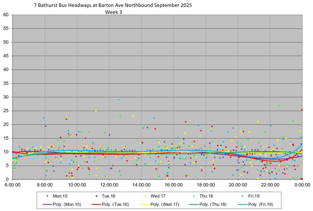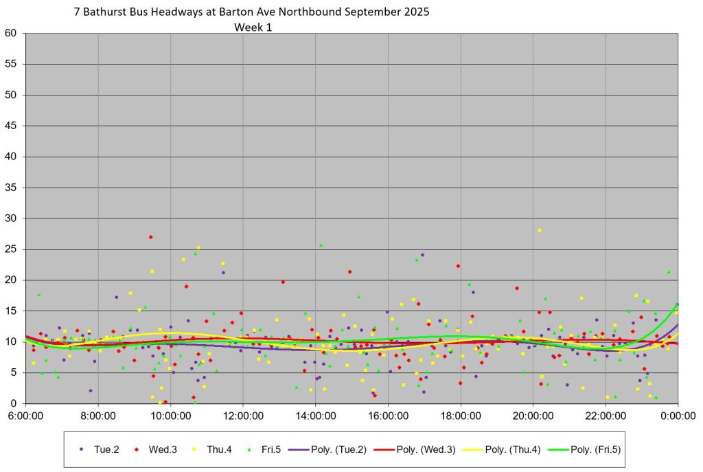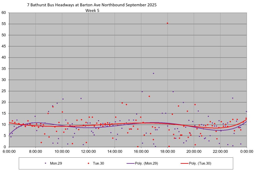 The charts in this section are in a format familiar to readers of service analyses on this site. They show the details of actual headways by time and day, as well as the range of values by quartile in September 2025. The location is at Barton Avenue, just north of Bathurst Station, showing the headway data for 7 Bathurst.