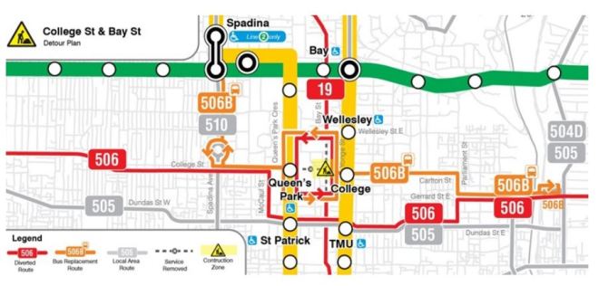 - After track replacement at Bay & College, the intersection re-opened on March 28. The 19 Bay bus returned to its normal route, and 506 Carlton buses now operate via College and Carlton rather than diverting around the work area. 506 Carlton cars will continue to divert via Dundas as testing and commissioning of new track and overhead remains to be done.