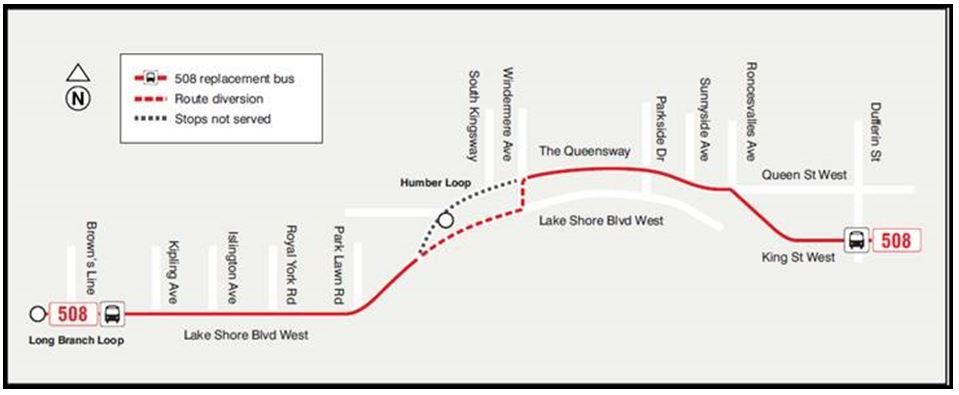 - From June 7 to September 5, 508 Lake Shore service will be suspended. It will resume as far as Kipling Loop in September-October, but will also be affected by diversions downtown for track work on King Street (details TBA).