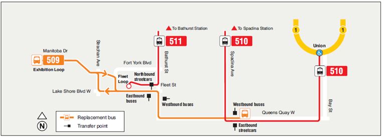- March 10 at 11pm to March 26 at 4am: 509 Harbourfront service will terminate at Fleet Loop. 511 Bathurst service will be replaced by buses for infrastructure work on Fleet Street.
