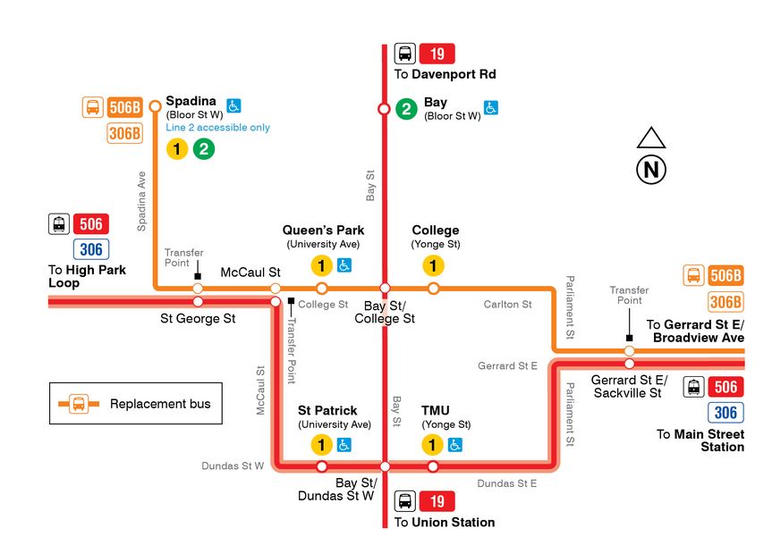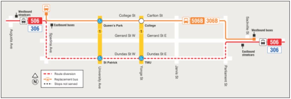- Between 11pm and 4am, 506/306 service on Carlton will divert bothways via Spadina, Dundas and Parliament for Toronto Hydro work.