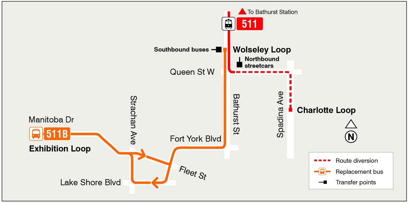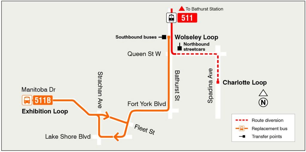- 511 Bathurst service will divert to King & Spadina (Charlotte Loop). Buses will run from Queen (Wolseley Loop) to Exhibition.