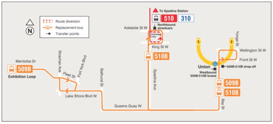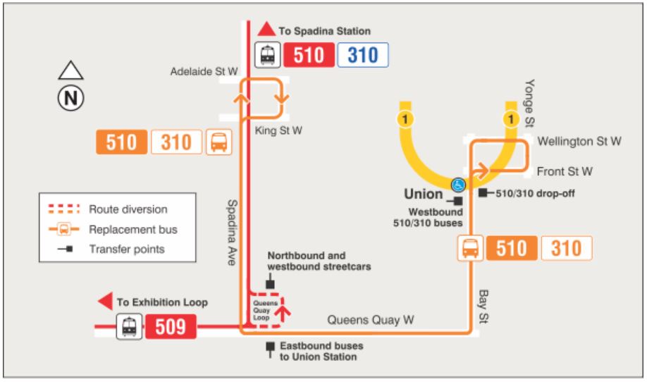 - 510/310 Spadina buses operate between King & Spadina (Charlotte Loop) and Union Station.