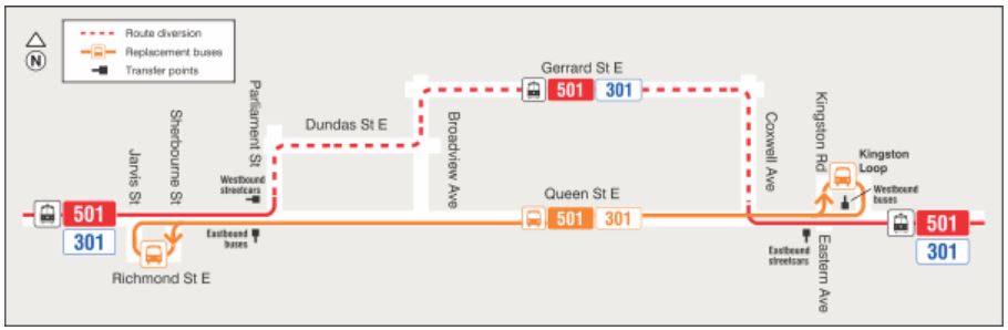 - 501/301 Queen cars will continue to divert both ways via Broadview, Dundas and Parliament.