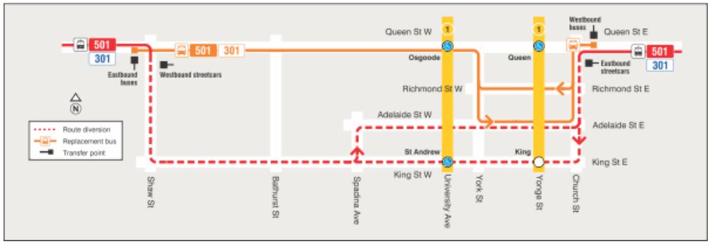 - 501 Queen cars divert both ways via Church, Richmond/Adelaide and York.