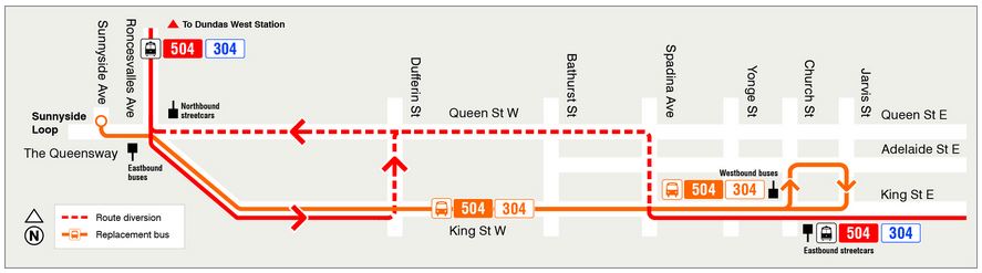 - 504/304 King streetcars will continue to operate to Distillery Loop.