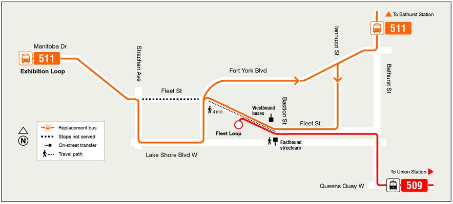 - Service on Fleet Street west of Fleet Loop is suspended. 509 Harbourfront cars will end at the loop, and 511 Bathurst will convert to bus operation.