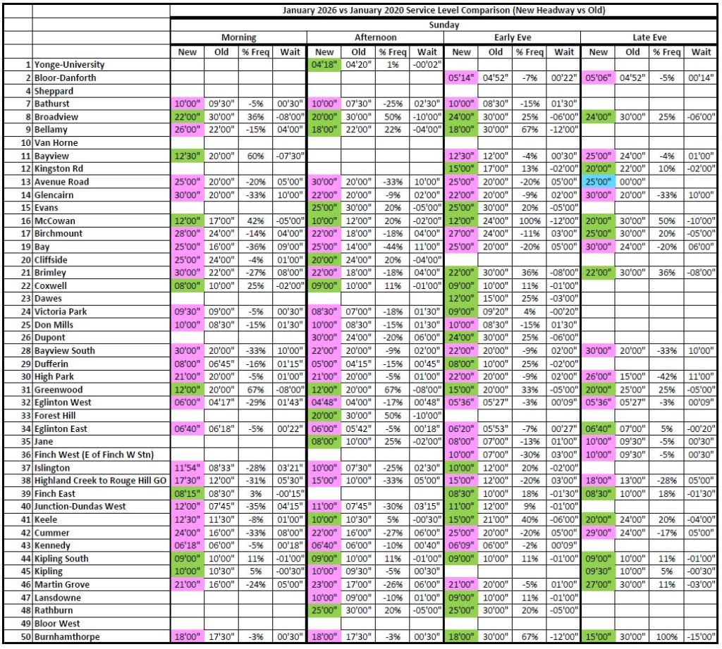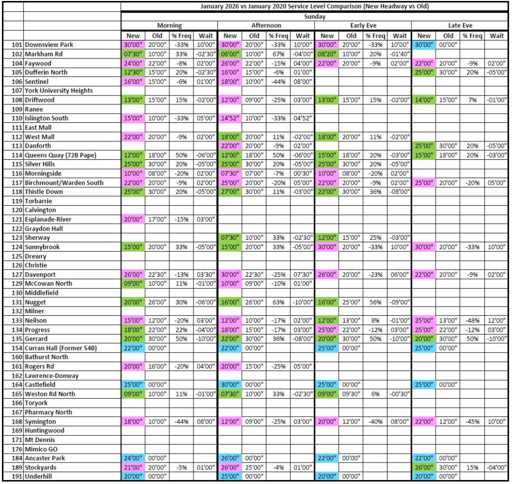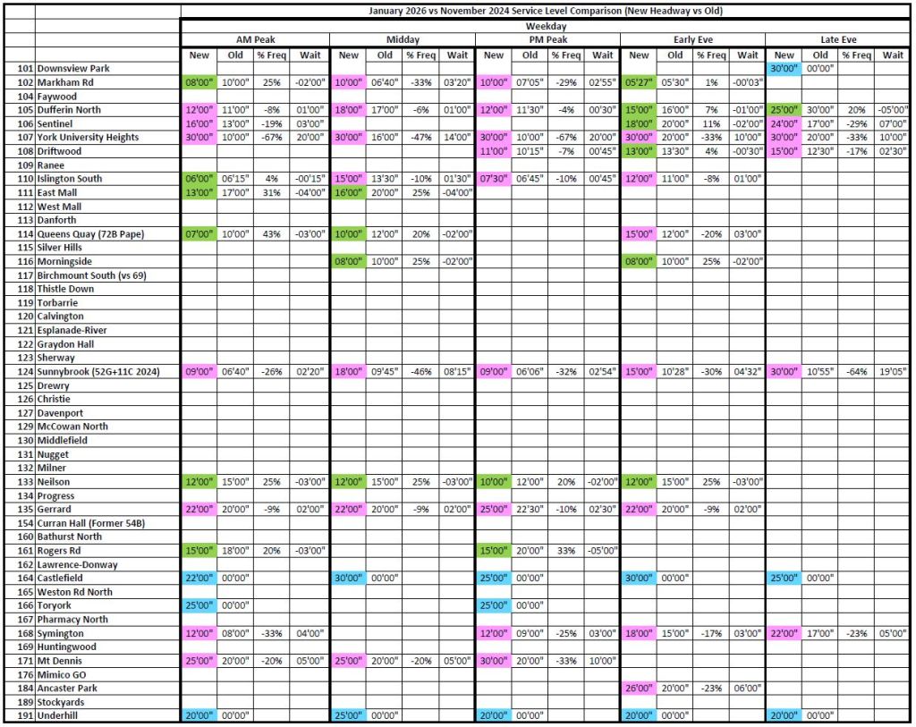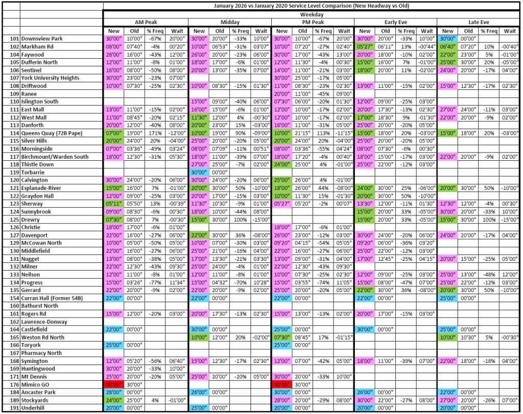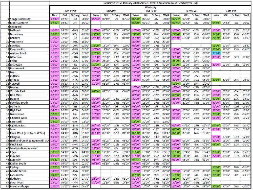 Where the 2026 and 2020 times are unchanged, the cells are blank to avoid clutter. Otherwise, the 2026 headways are colour coded: