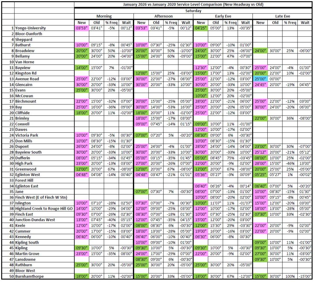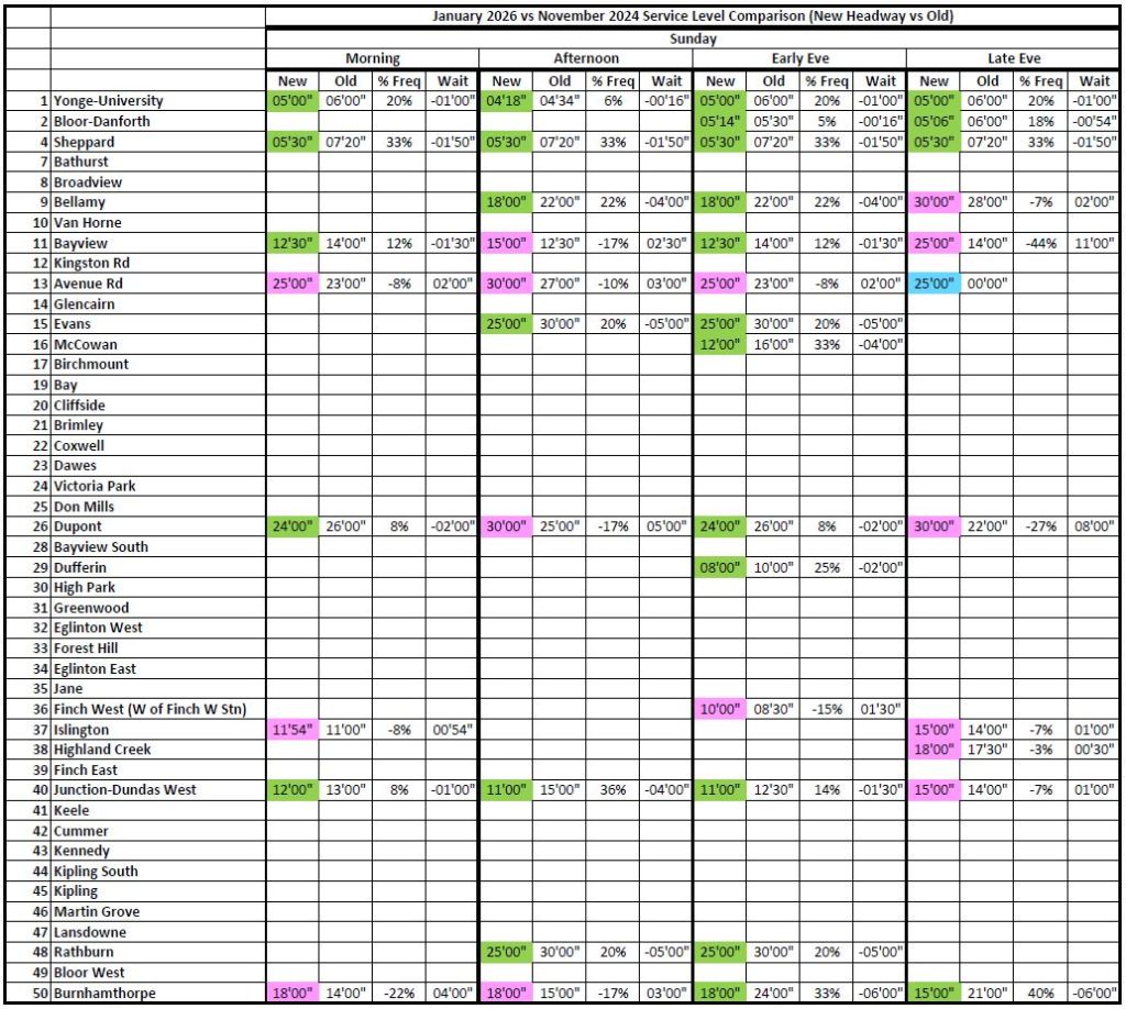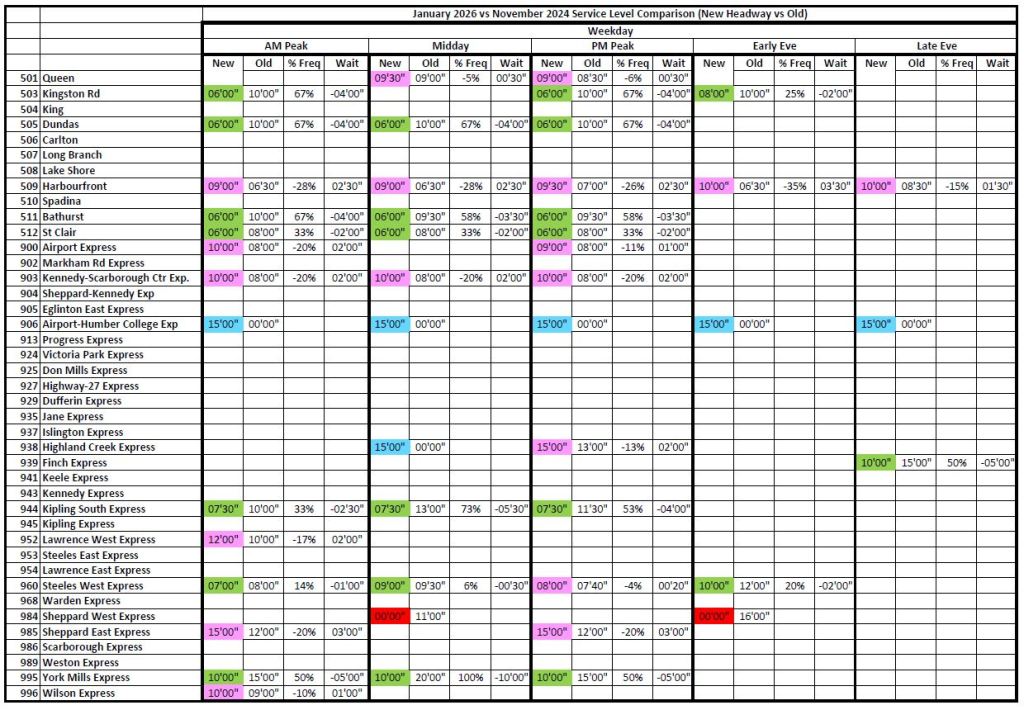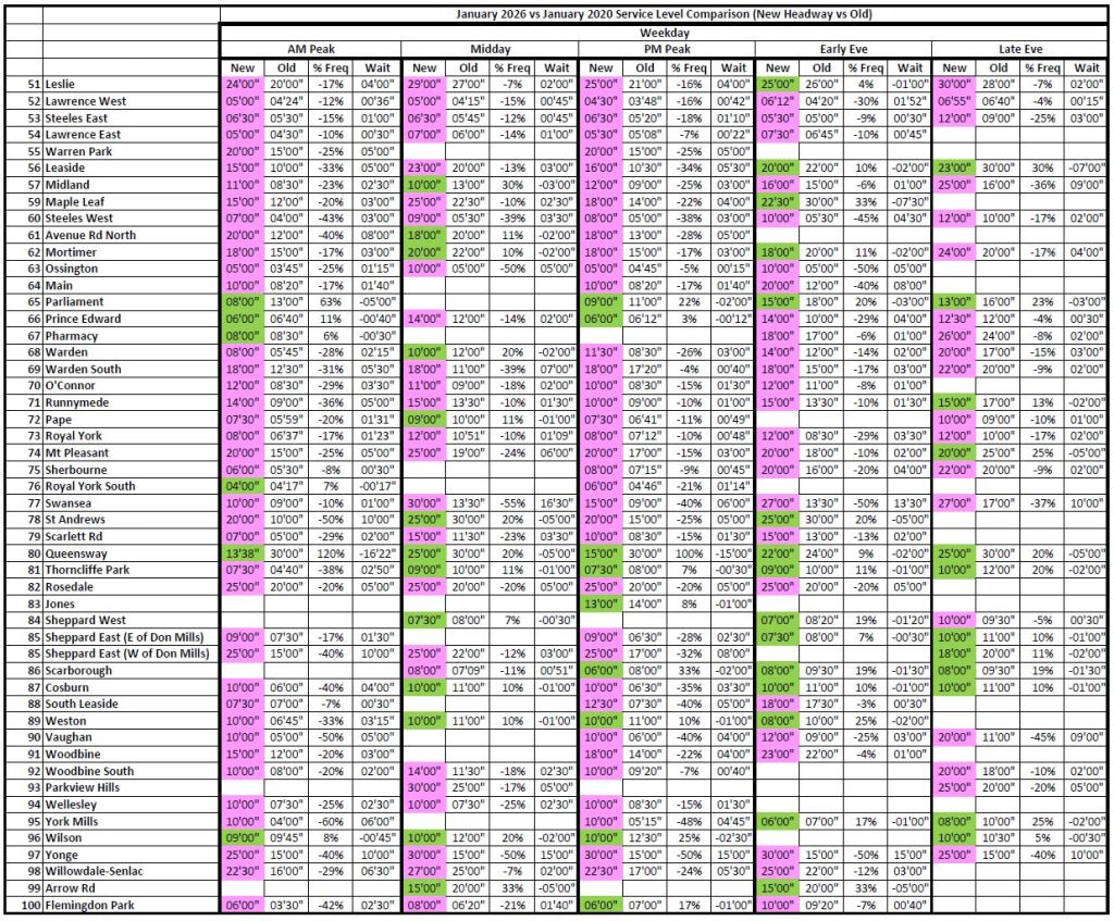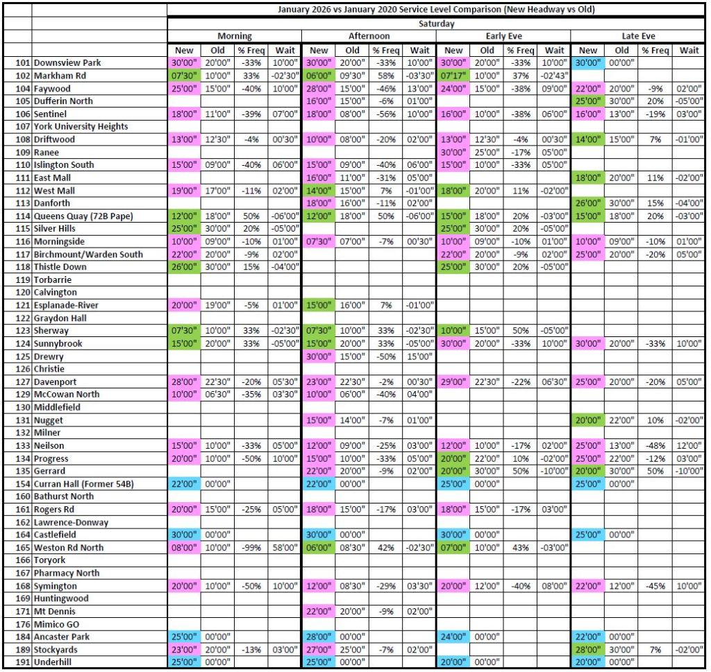 Where the 2026 and 2020 times are unchanged, the cells are blank to avoid clutter. Otherwise, the 2026 headways are colour coded:
