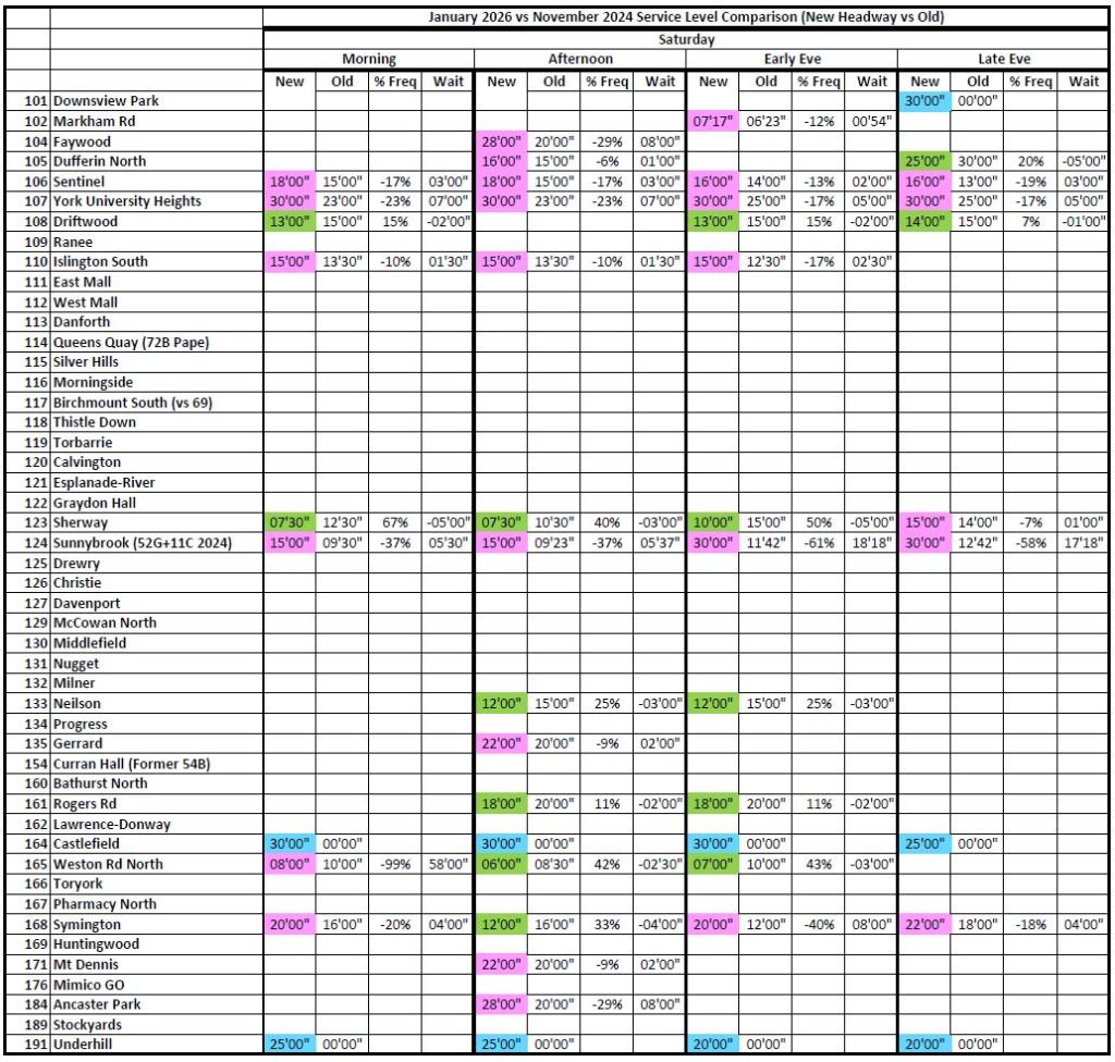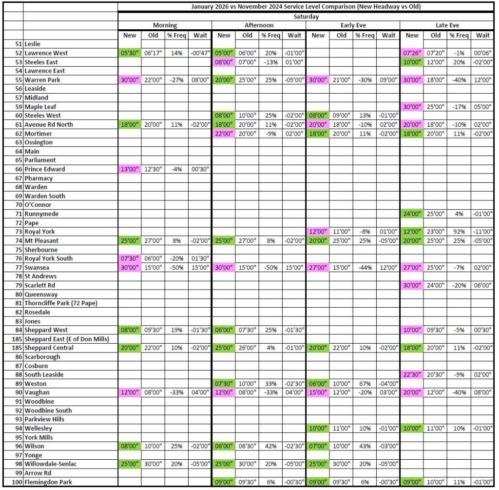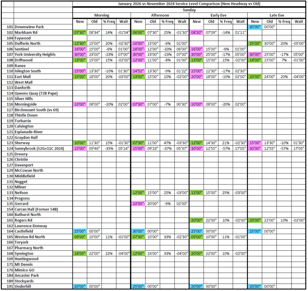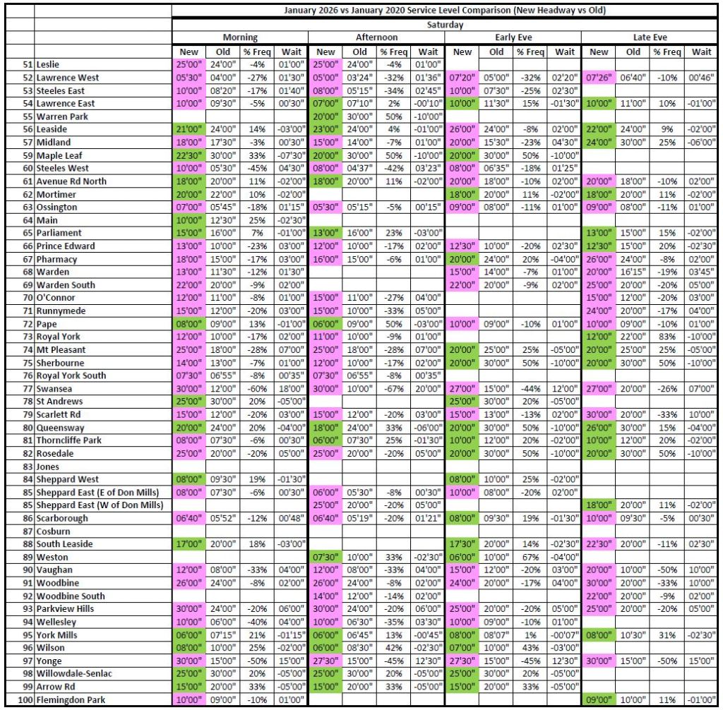 Where the 2026 and 2020 times are unchanged, the cells are blank to avoid clutter. Otherwise, the 2026 headways are colour coded: