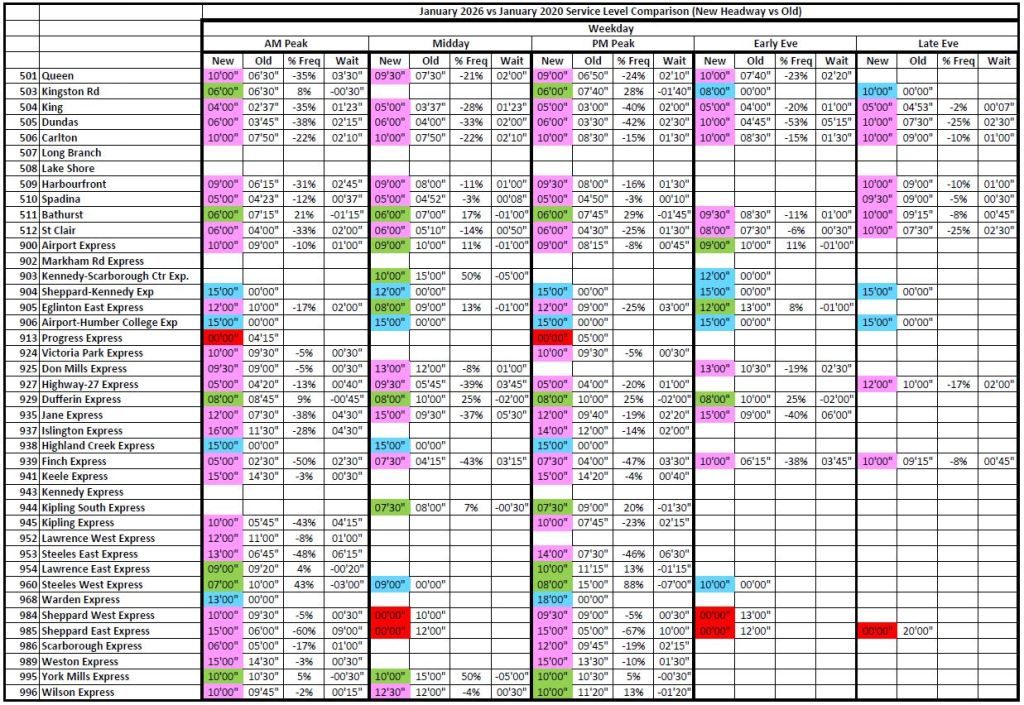 Note that in January 2020, 503 Kingston Road and 505 Dundas operated with buses, and headways then reflected the lower capacity of those vehicles.