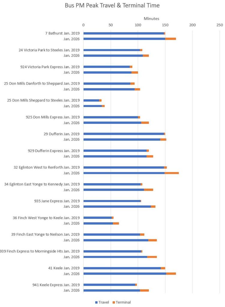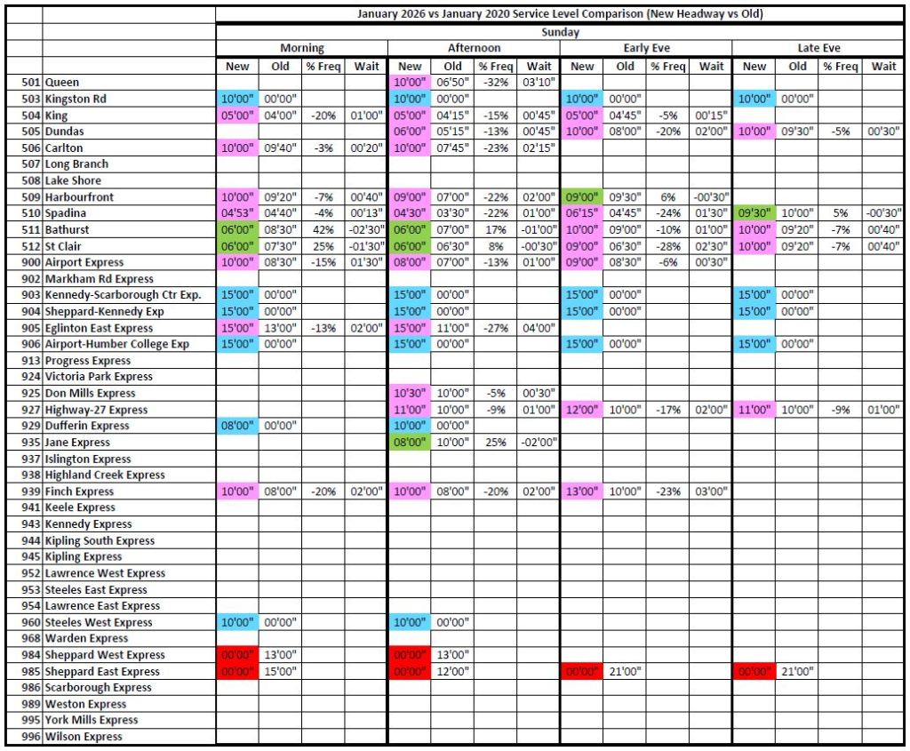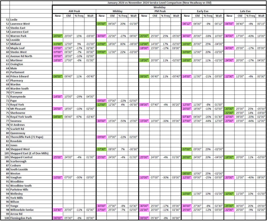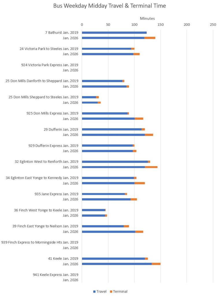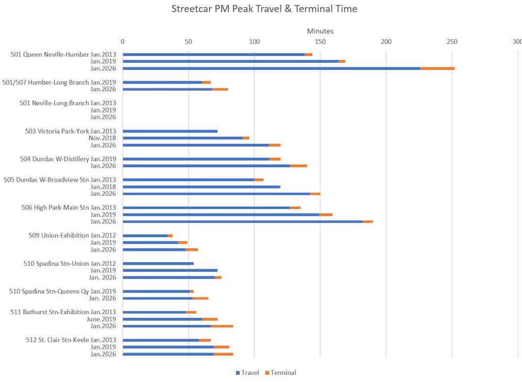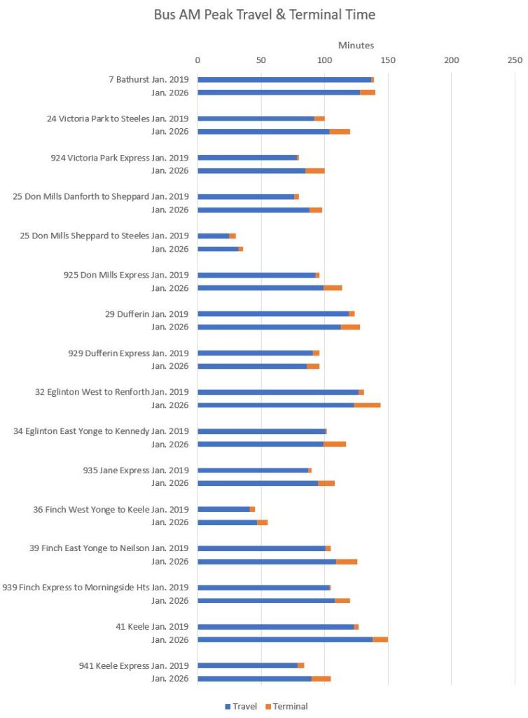 Note that travel times are longer in 2026 even on St. Clair and Spadina which have reserved lanes.