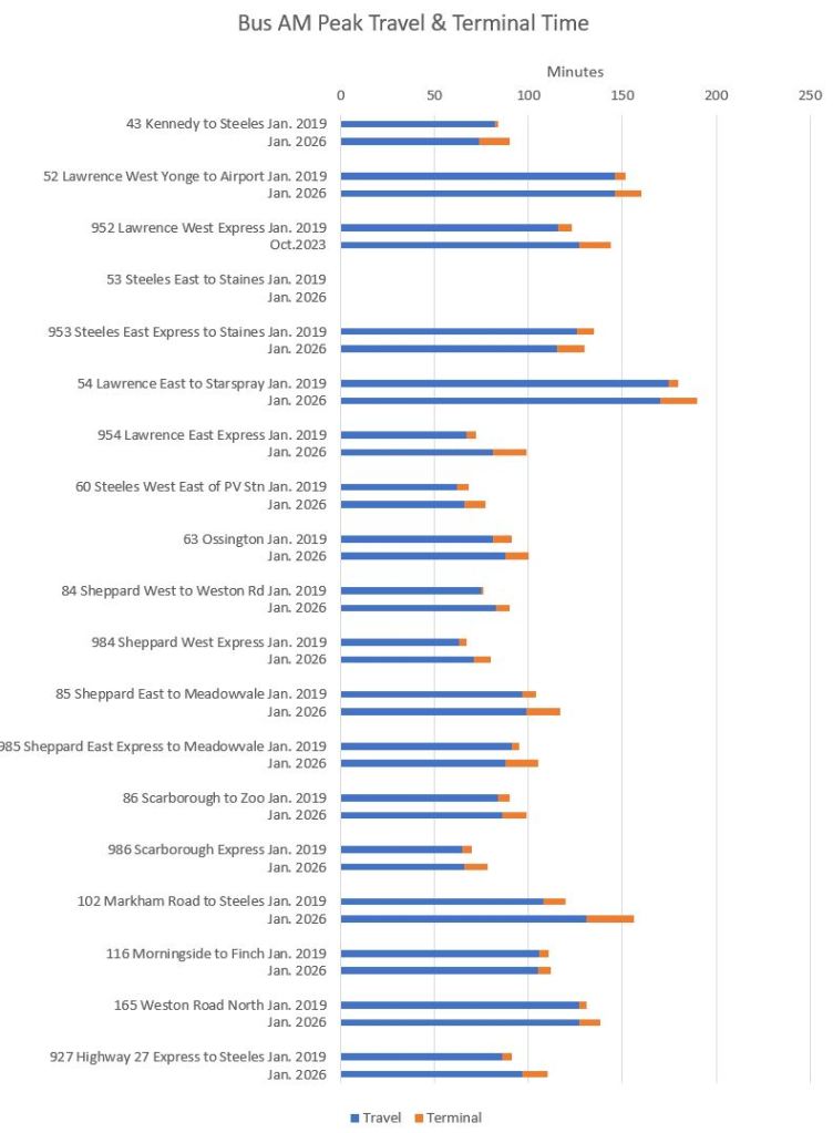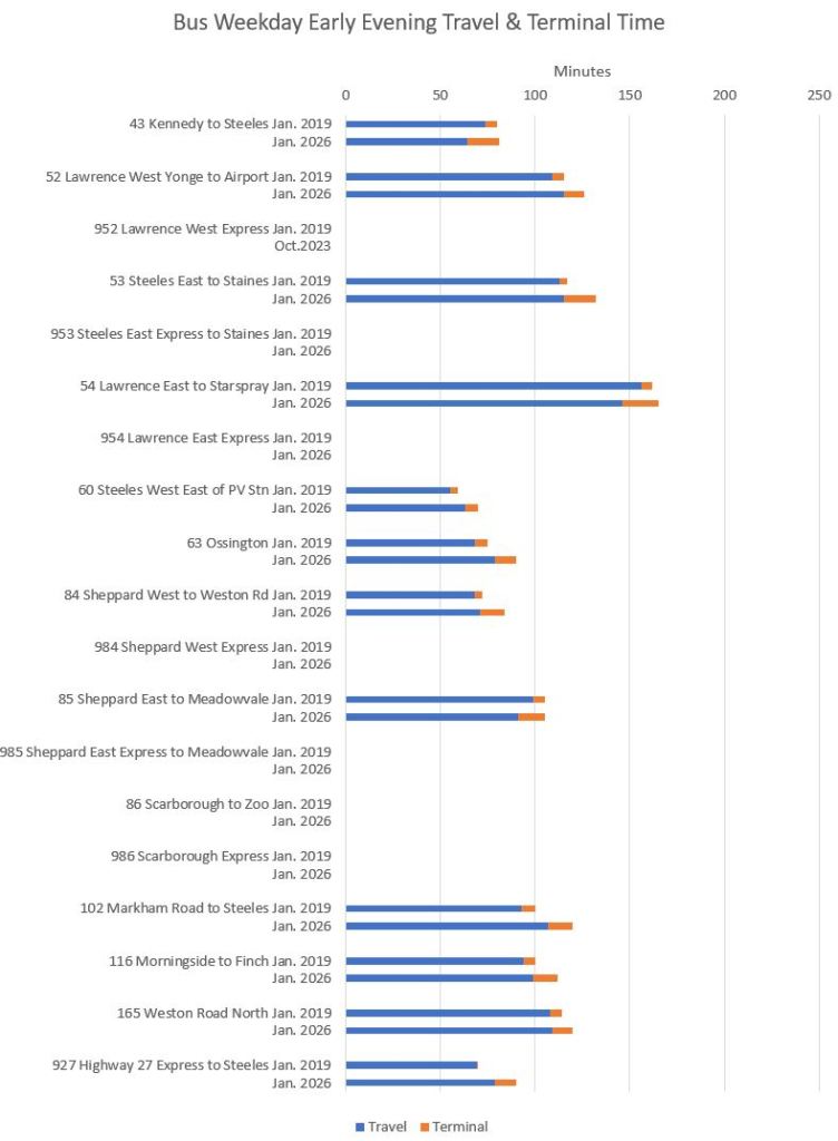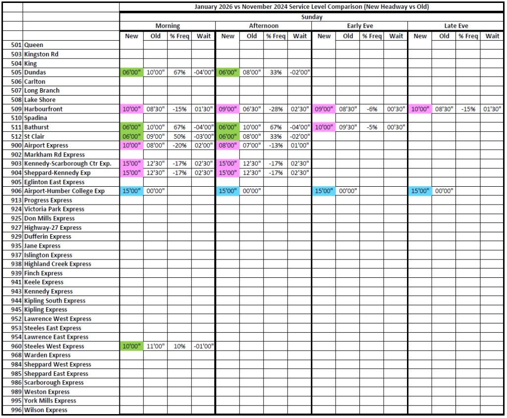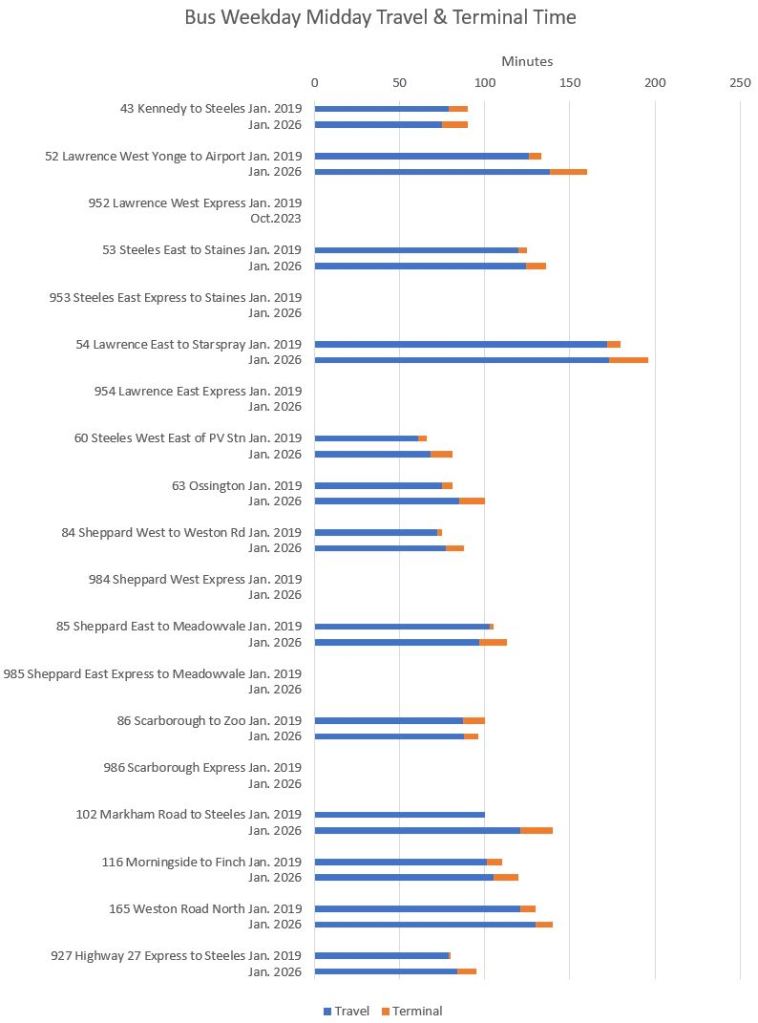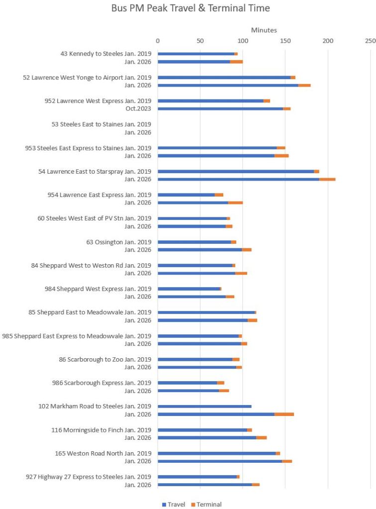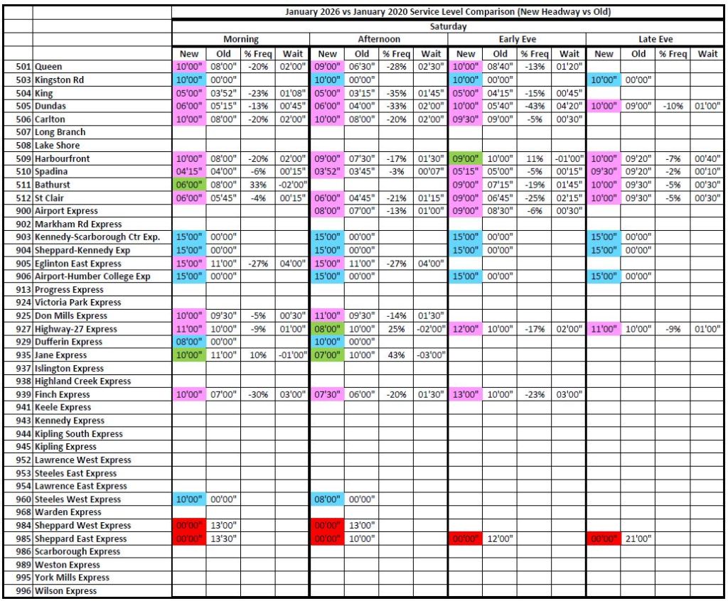 Note that travel times are longer in 2026 even on St. Clair and Spadina which have reserved lanes.