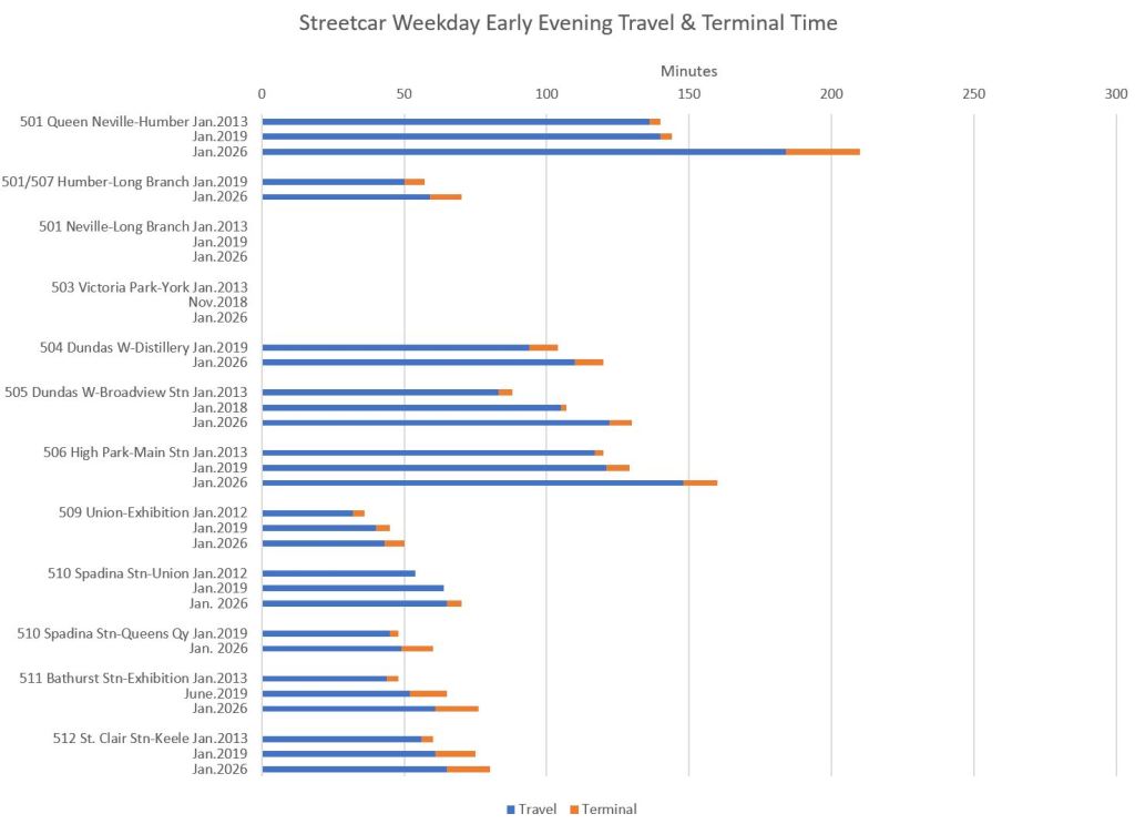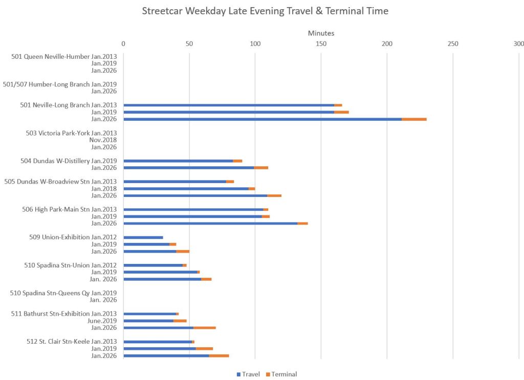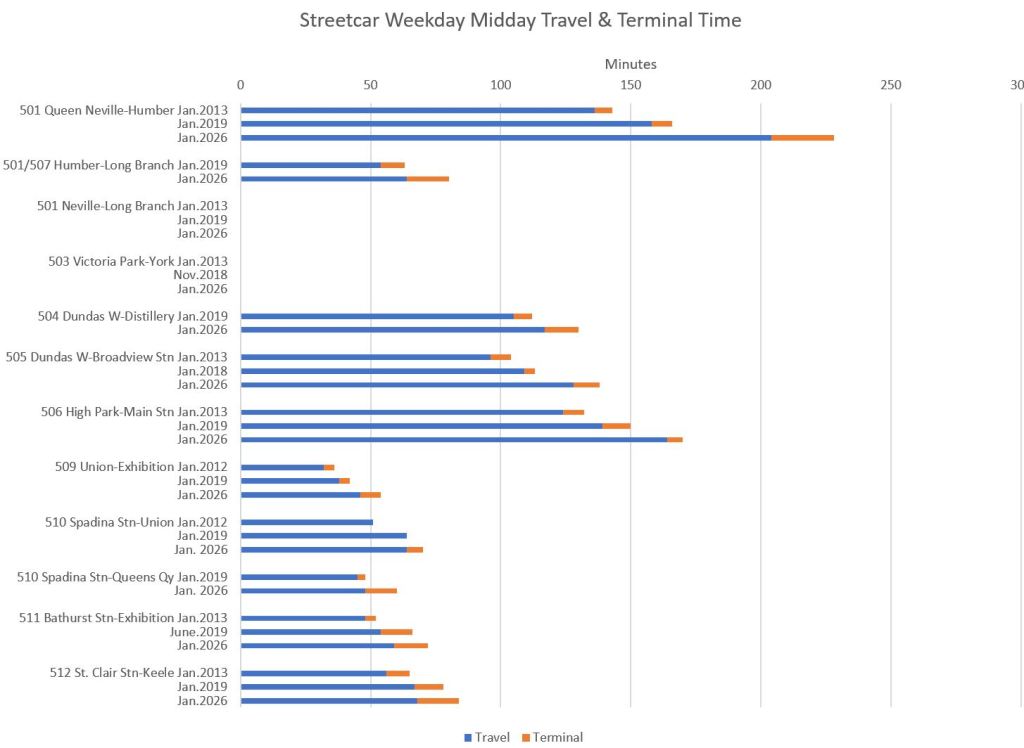 The charts in this section compare travel times in January 2026 with values in 2019 and, for streetcars, with 2013. In almost every case, scheduled travel times in 2026 are longer than in 2019.
