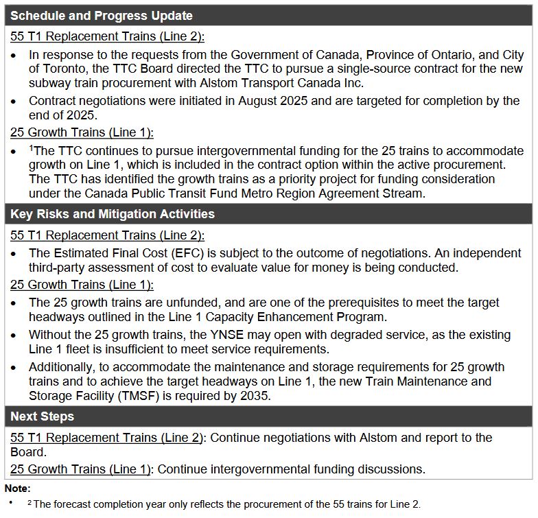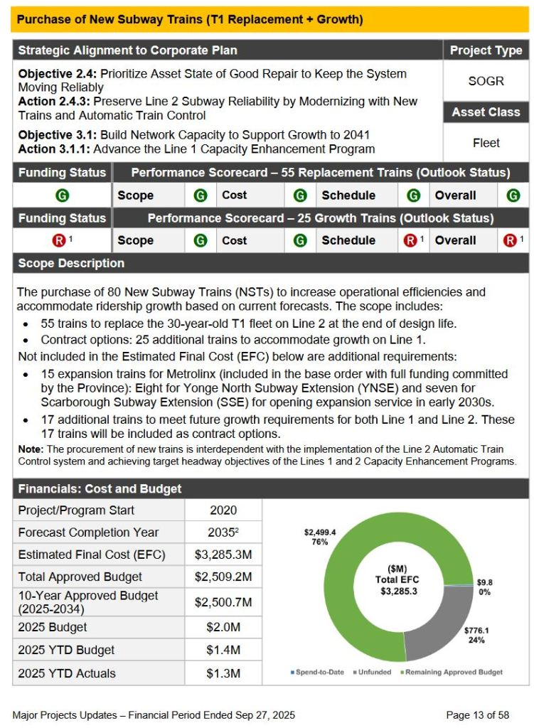 The TTC’s description of the subway fleet plan changed between the April 2025 and September 2025 versions in the target dates for specific groups of trains. Of particular concern is the 2035 date for the 55 replacement trains on Line 2. This implies that the existing T-1 fleet will have to be kept at least partly in operation for the next nine years, and that the trains for extensions will come earlier in the program. This will affect future maintenance budgets and train reliability on Line 2.