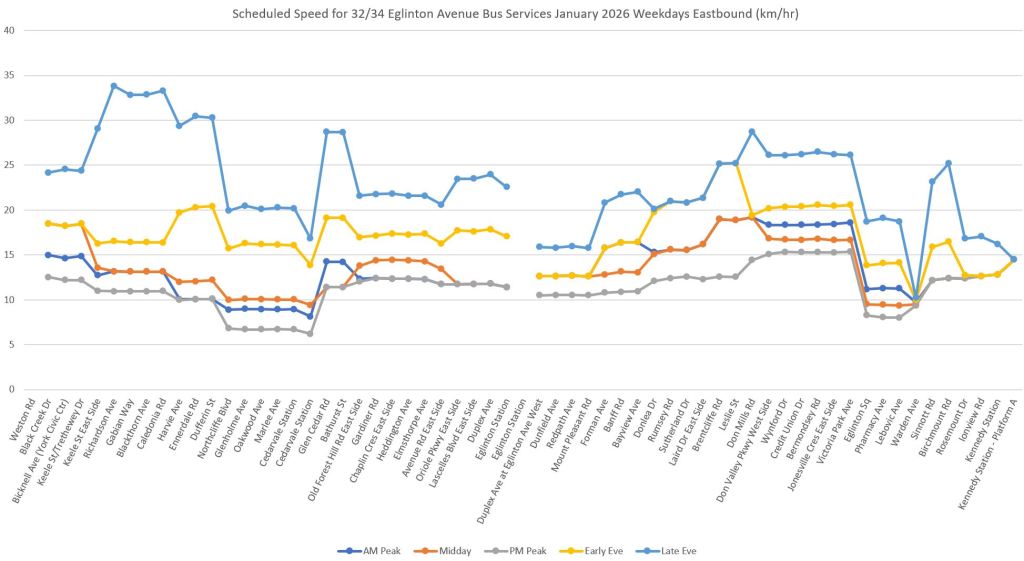 The charts below show the scheduled speeds for buses in January and trains in February 2026. The travel times are taken from the GTFS electronic schedules published by the TTC on February 3, as are the stop spacings.