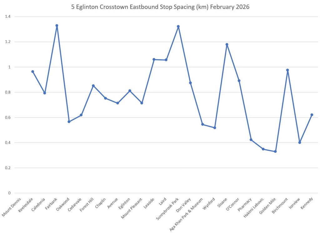 I’m having difficulty reading the LRT stop spacing chart. The chart shows Birchmount station as 1km from Golden Mile, but the stations IRL are 800-820m apart, depending upon how you measure.