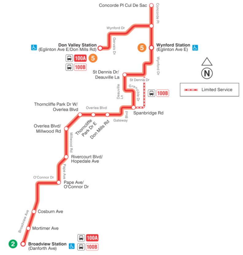 - 100 Flemingdon Park: The existing 100A service between Broadview Station and Flemingdon Park will not change, but buses will serve Don Valley Station. Branch 100B will operate via Linkwood Lane replacing the 34C, but will only run in peak periods.