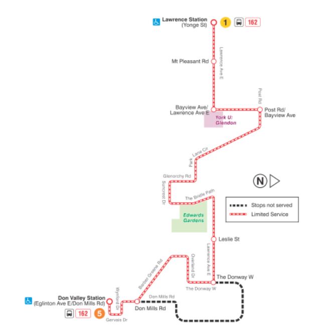 - 162 Lawrence-Donway: The east end of this route now loops around The Donway, but it will be changed to run to Don Valley Station. Service on The Donway will be provided by 51B Leslie.