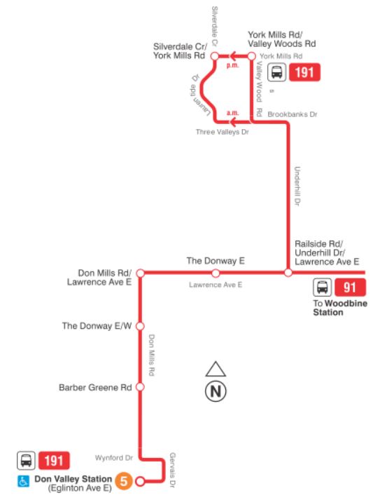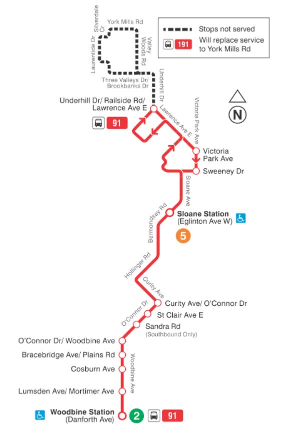 - 91 Woodbine/191 Underhill: The 91 Woodbine will be cut back to end at Lawrence Avenue. Service north to York Mills will be provided by 191 Underhill which will run to Don Valley Station.