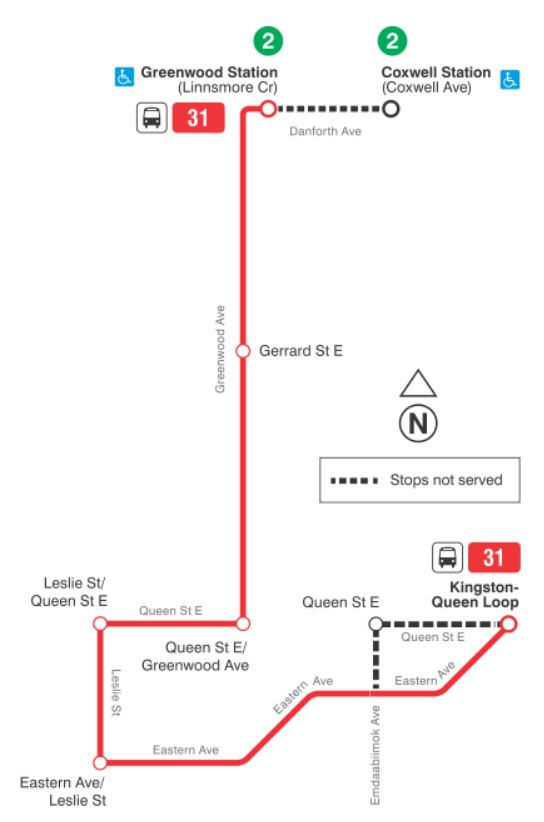 The 31 Greenwood bus will switch back to Greenwood Station from Coxwell Station where it was diverted for elevator construction. At the south end of the route, buses will now use Woodbine Loop as their terminus rather than an on-street loop via Queen.