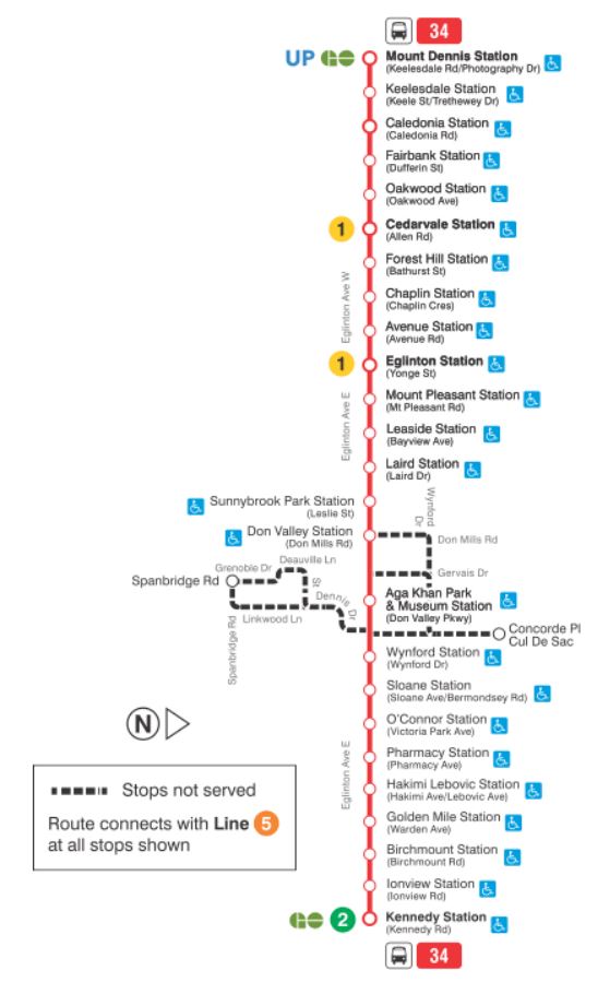 - 34 Eglinton: This bus will parallel the 5 Eglinton LRT between Kennedy Station and Mount Dennis. It will run every 20 minutes.