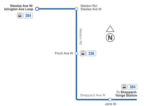 - 384 Sheppard West Night Bus: The 384 is extended to Steeles and Islington making connections with night services on Finch and Islington. Service on the former loop via Bradstock Road and Rivalda Road is discontinued.
