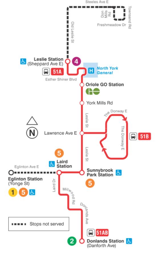 - 51 Leslie/56 Leaside: Both the 51 and 56 routes now run west via Eglinton to Eglinton Station. They will be amalgamated removing the service on Eglinton west of Laird Station. The amalgamated 51 route will run from Donlands Station north to Leslie Station on Line 4 at Sheppard. A 51B short turn will serve The Donway loop now served by 162 Lawrence-Donway. Service will operate every 11-12 minutes between Donlands Station and Lawrence, and will split into 12-24 on the 51A and 51B branches to Leslie Station and Don Mills.