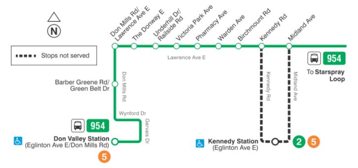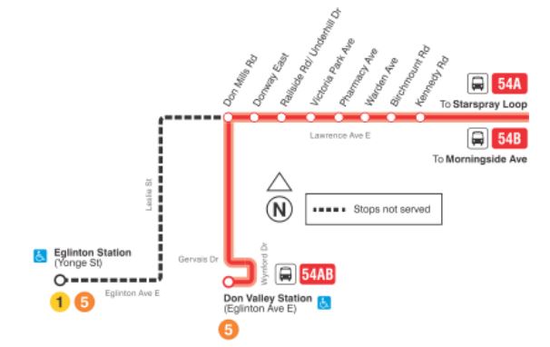 - 54/954 Lawrence East: The 54 service will be removed west of Don Mills and will run south to Don Valley Station. The 954 express service will no longer run to Kennedy Station, but will continue west on Lawrence and south to Don Valley Station. There is no change to 354 Lawrence East night bus which will continue to operate west on Eglinton from Don Mills to Yonge.