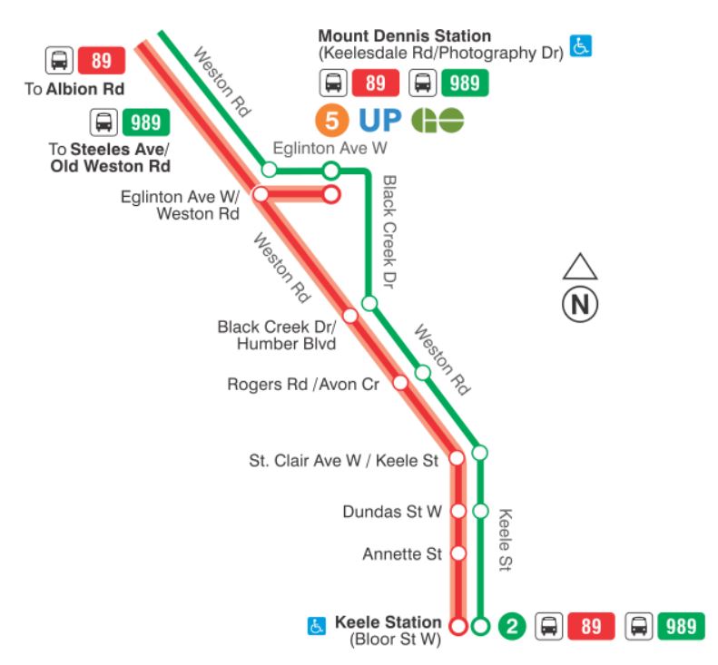 - 89/989 Weston Road: The local and express services on Weston Road will divert east on Eglinton to serve Mount Dennis Station.