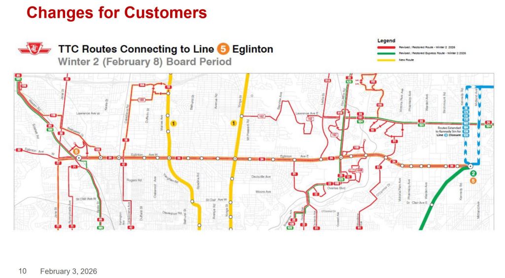 The TTC has not yet issued its detailed memo listing the operating designs for bus service changes effective February 8, 2026. When it is available, I will update this article with all of the usual information including a spreadsheet with before-and-after service comparisons. Information in this preliminary article is culled from a presentation at the TTC Board meeting of February 3, various TTC web pages, and the GTFS version of schedules (electronic versions used by trip planning apps).