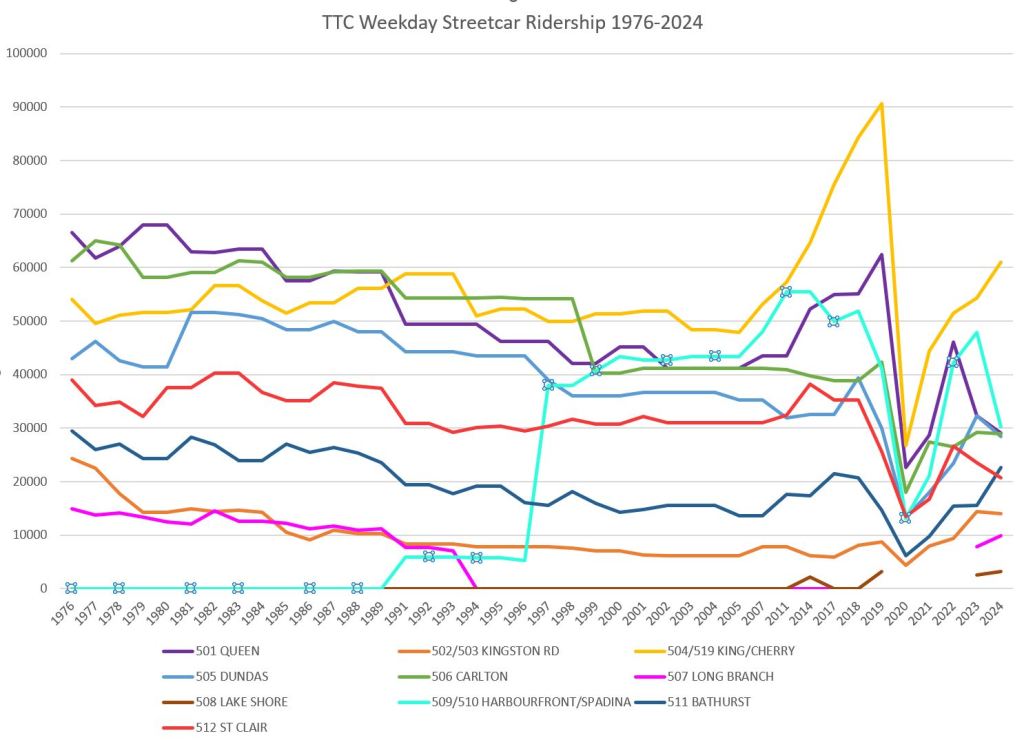 One might argue that this is a chicken-and-egg situation with service levels following demand. However, 504 King by contrast did not see a post 2020 fall-off and its ridership grew strongly through 2024. Have riders simply given up on the Queen car even before its further disruption with Ontario Line construction diversions? Until (and if) the TTC moves to six-minute service on the 501, we will not know whether riders can be lured back.