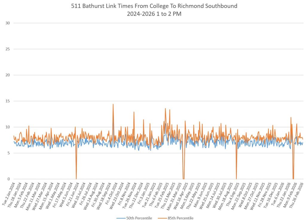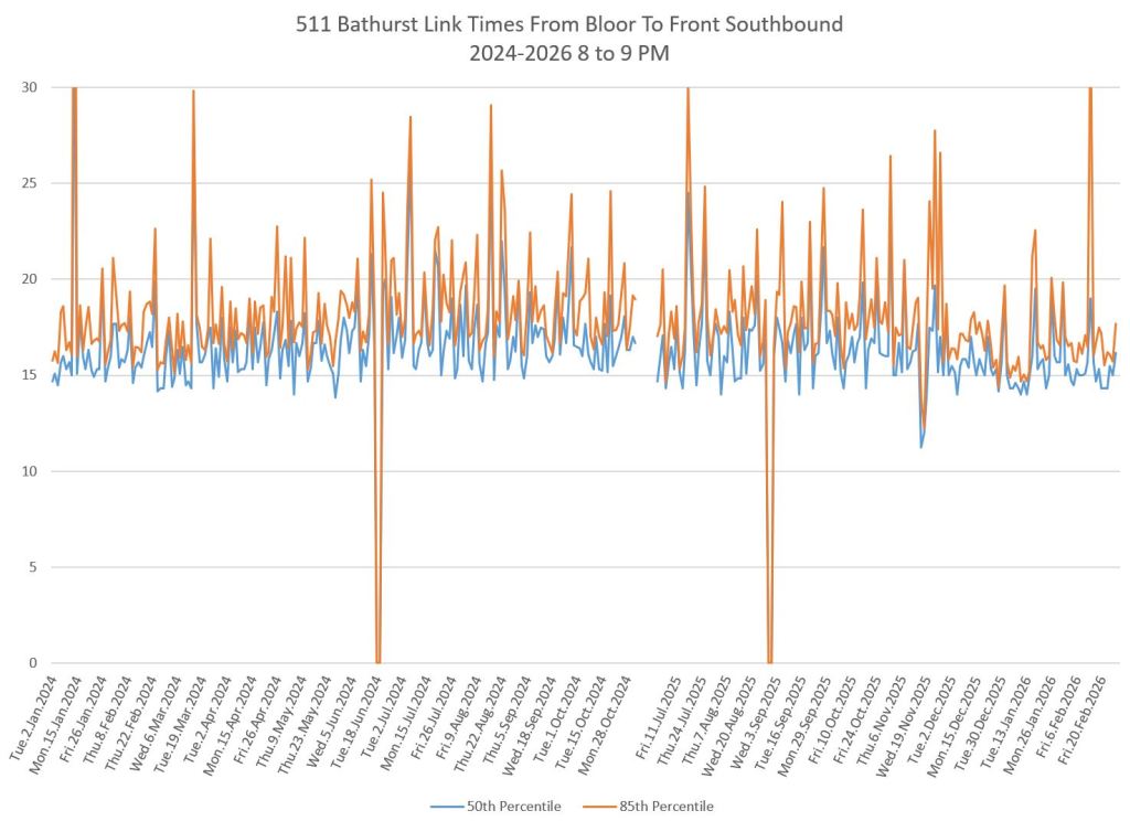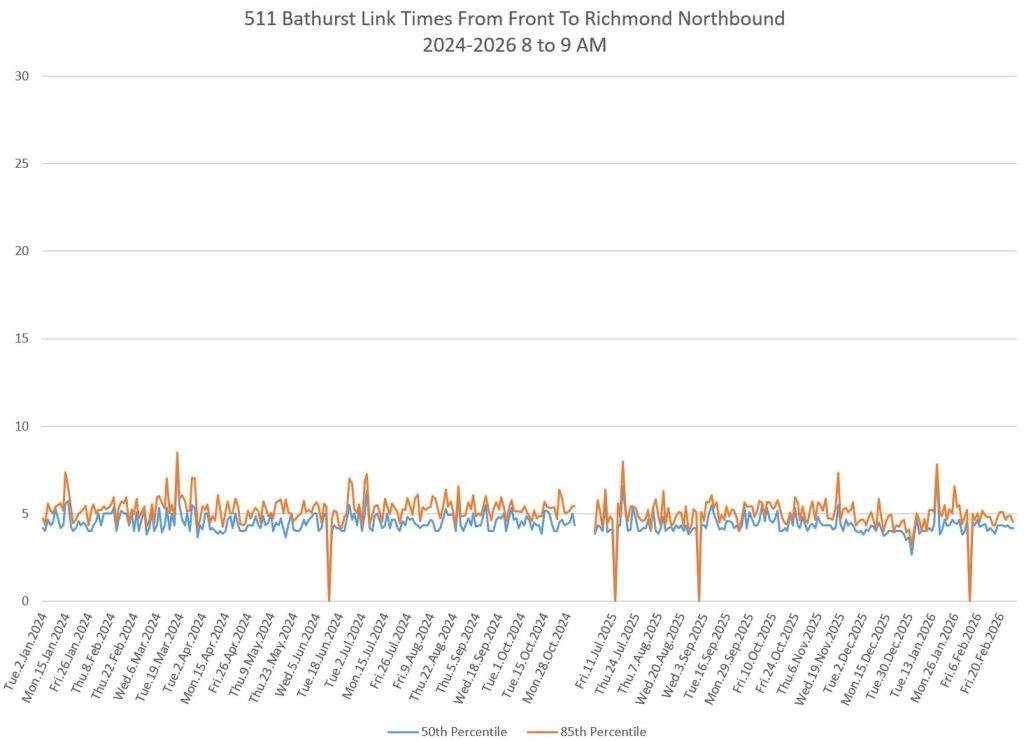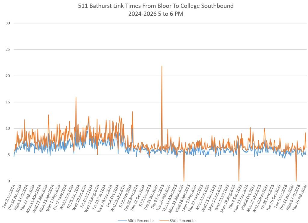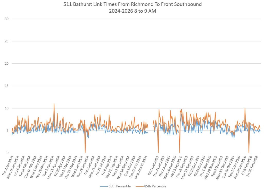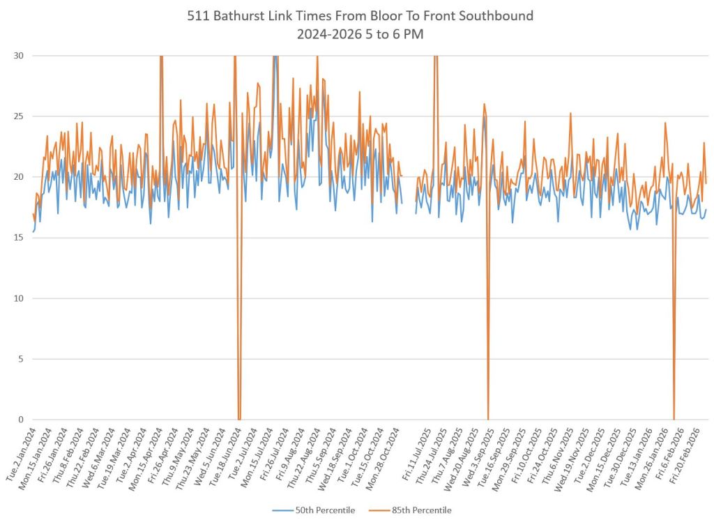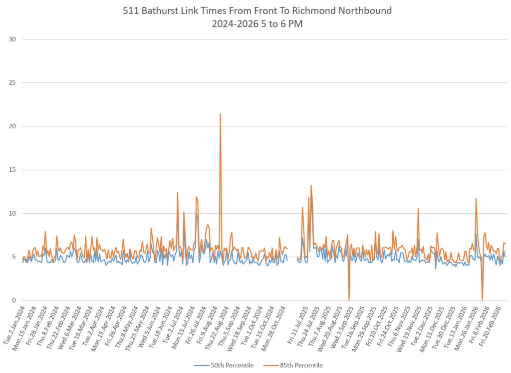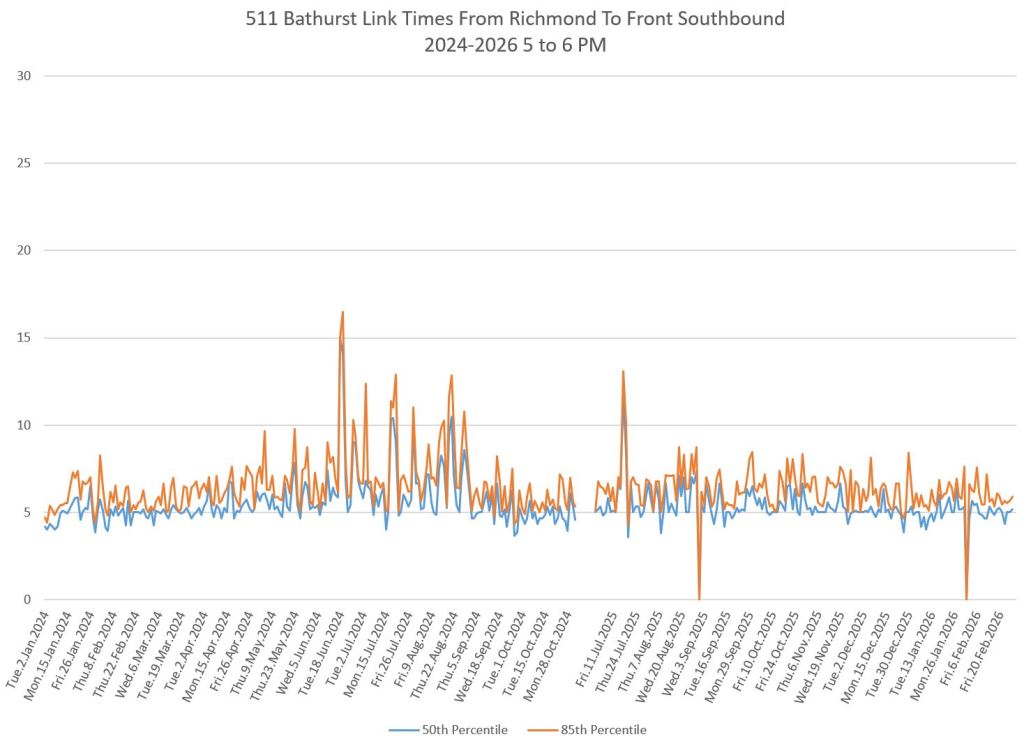 The first part of this article reviews travel times over various parts of the route from January 2024 to February 2026. Between November 2024 and June 2025, the south end of the streetcar route was diverted for construction. Data for this period is included in the charts only for locations north of King which had streetcar service through the entire 2+ year period.