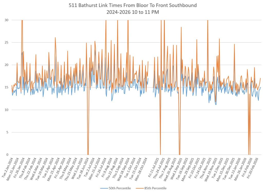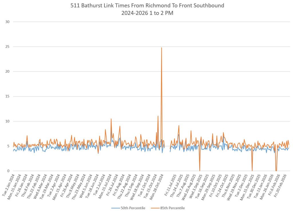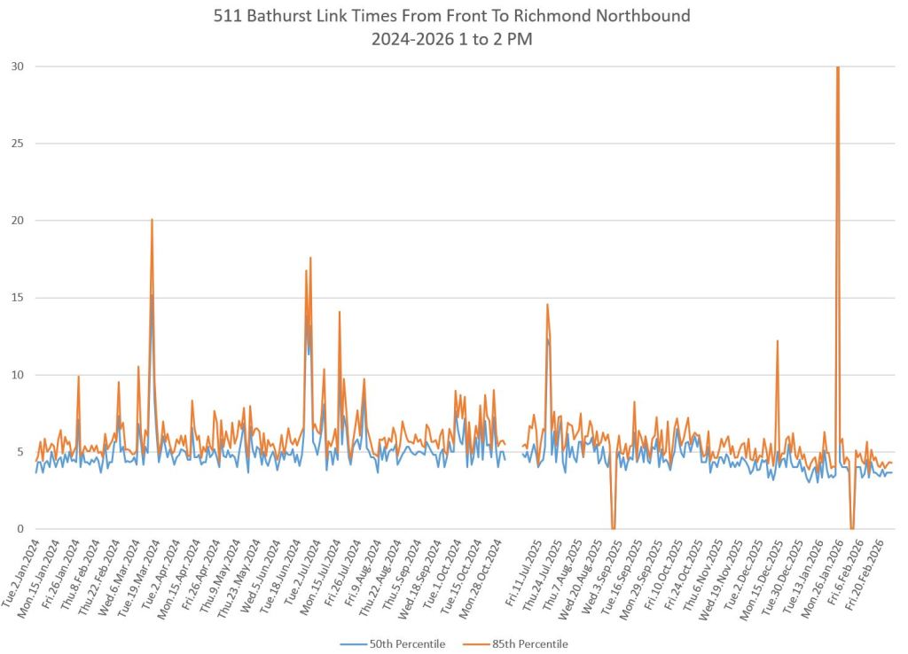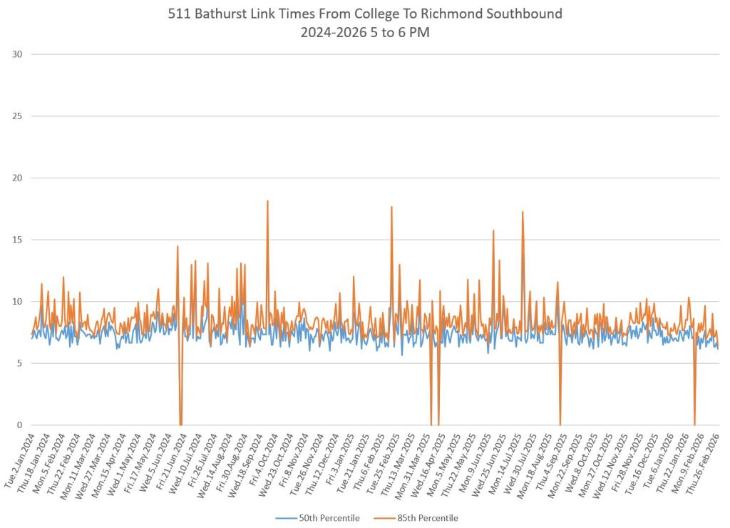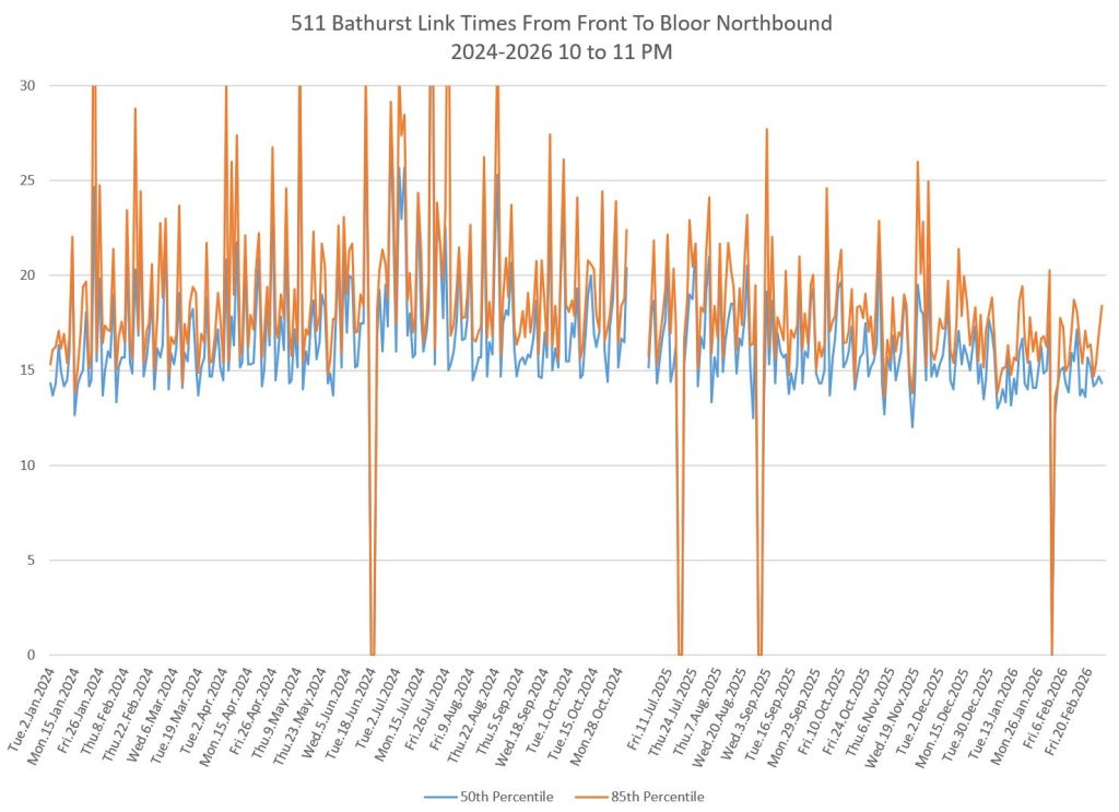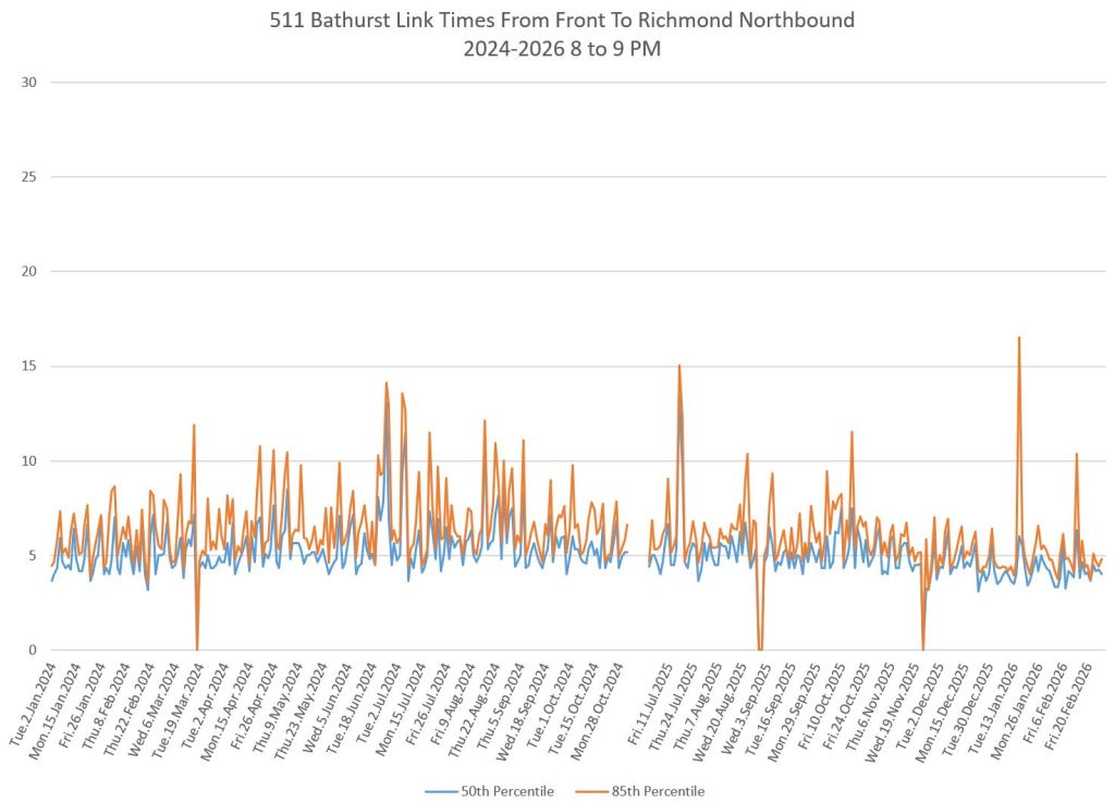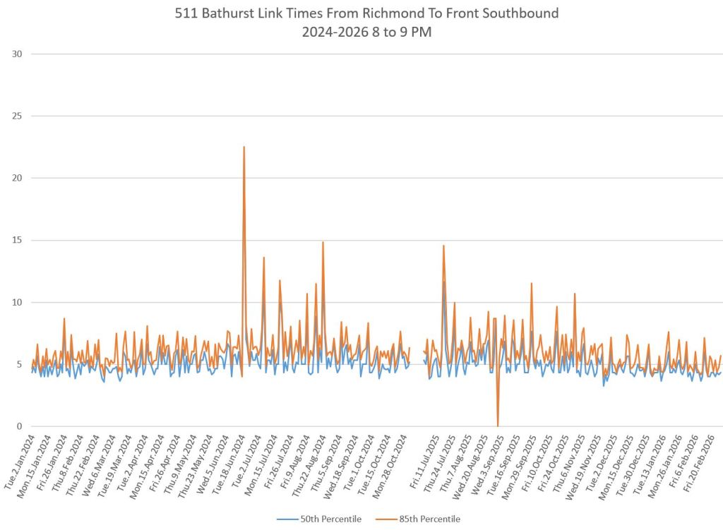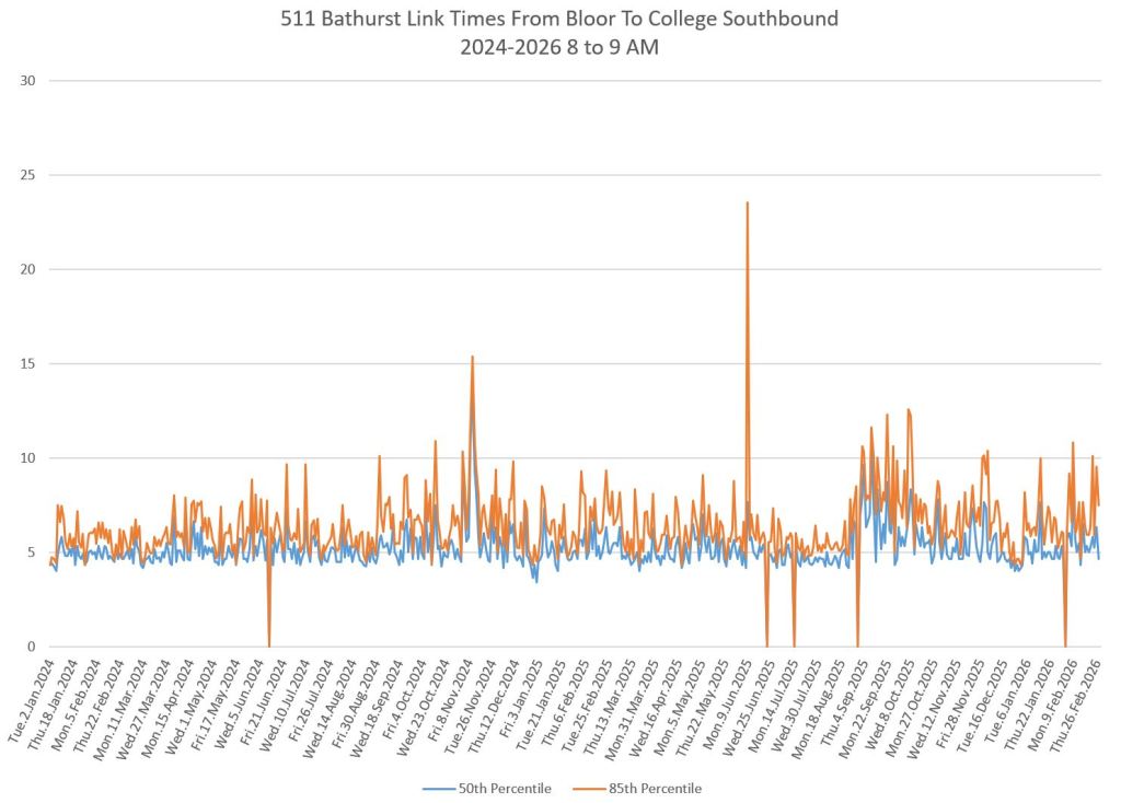 The first part of this article reviews travel times over various parts of the route from January 2024 to February 2026. Between November 2024 and June 2025, the south end of the streetcar route was diverted for construction. Data for this period is included in the charts only for locations north of King which had streetcar service through the entire 2+ year period.