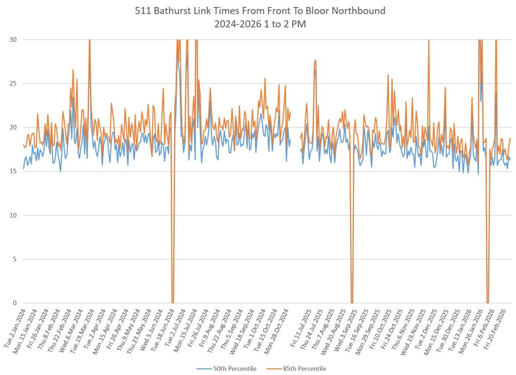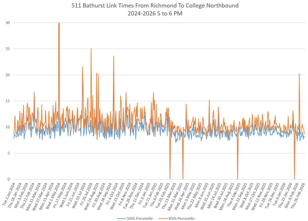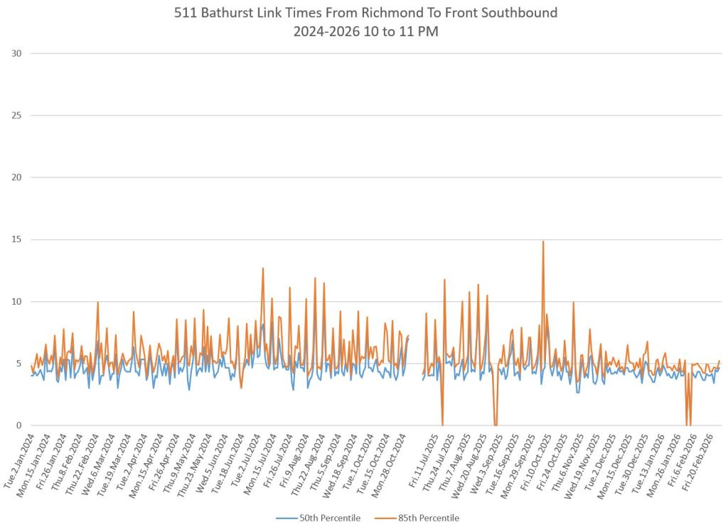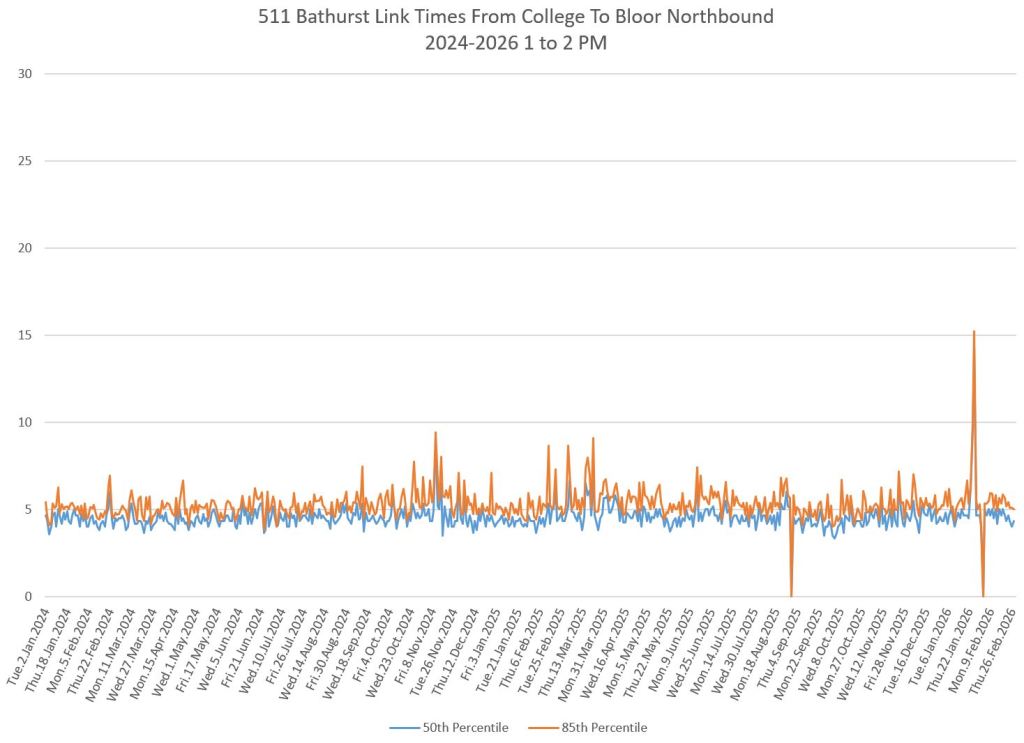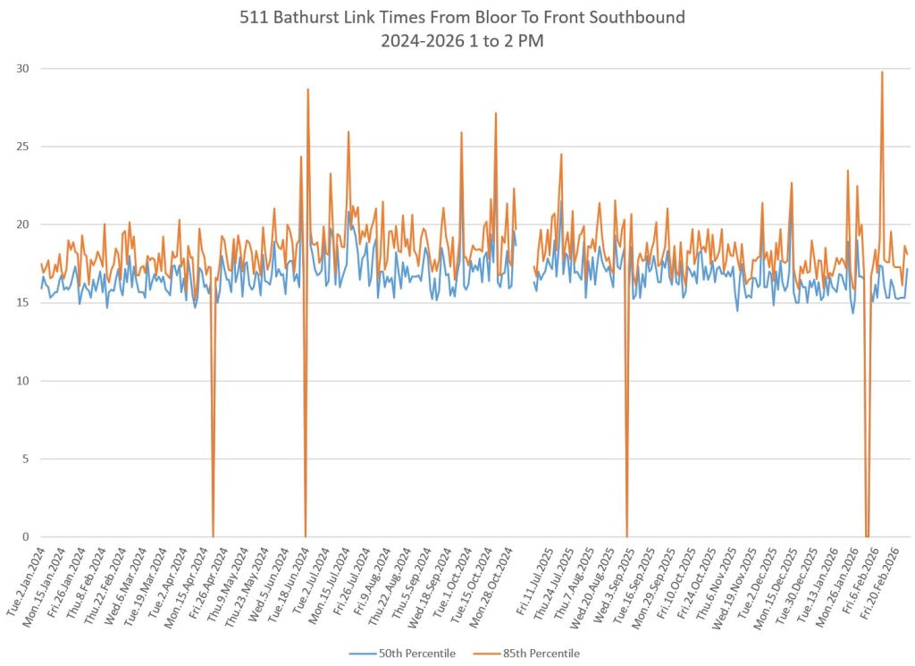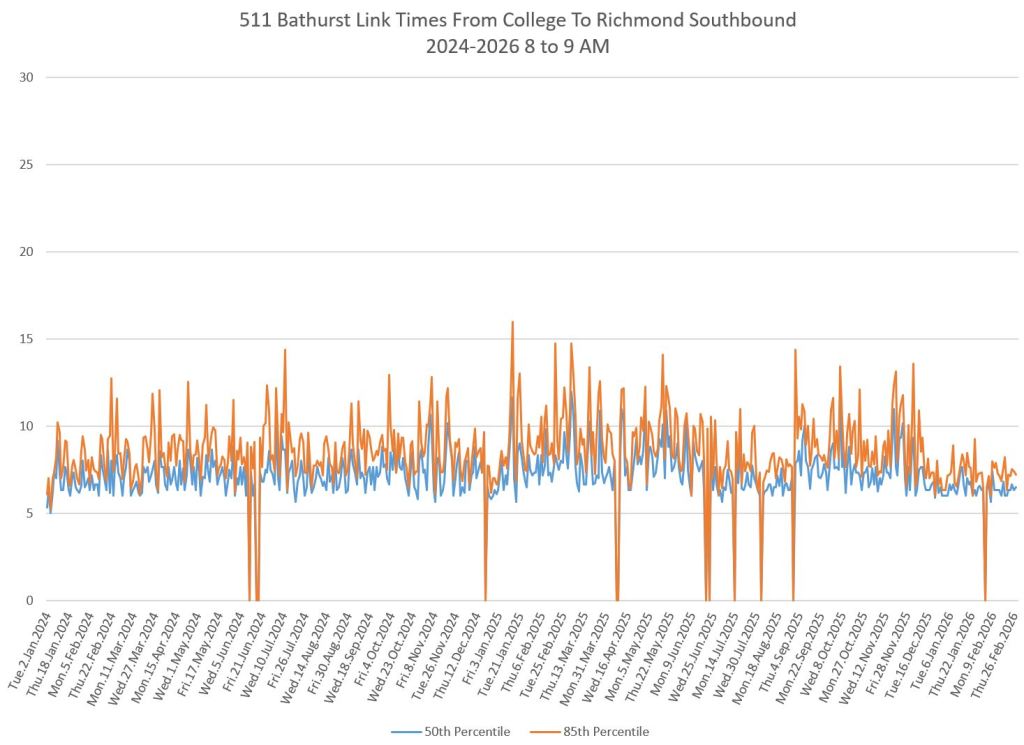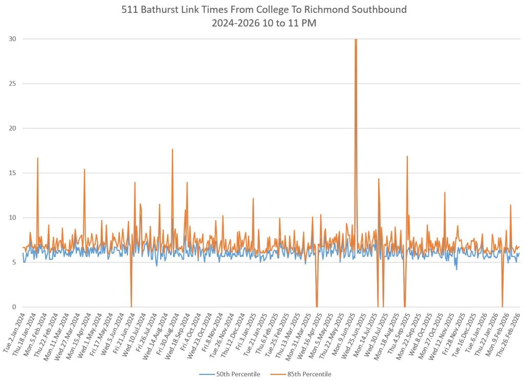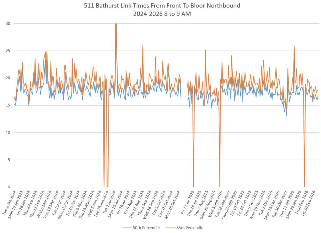 The first part of this article reviews travel times over various parts of the route from January 2024 to February 2026. Between November 2024 and June 2025, the south end of the streetcar route was diverted for construction. Data for this period is included in the charts only for locations north of King which had streetcar service through the entire 2+ year period.