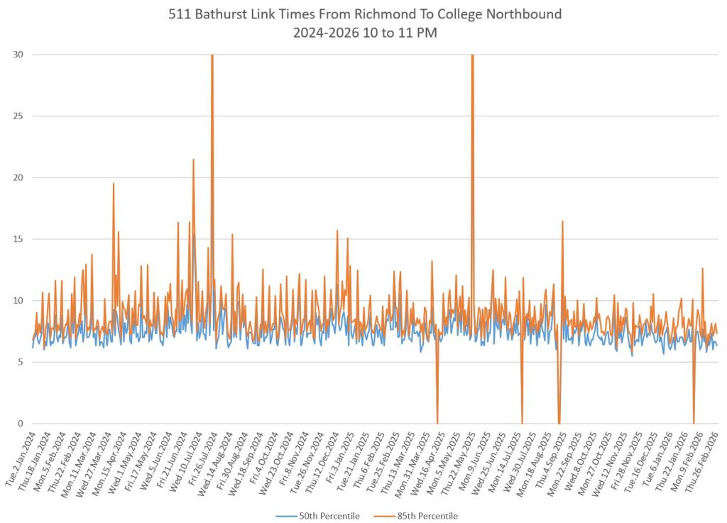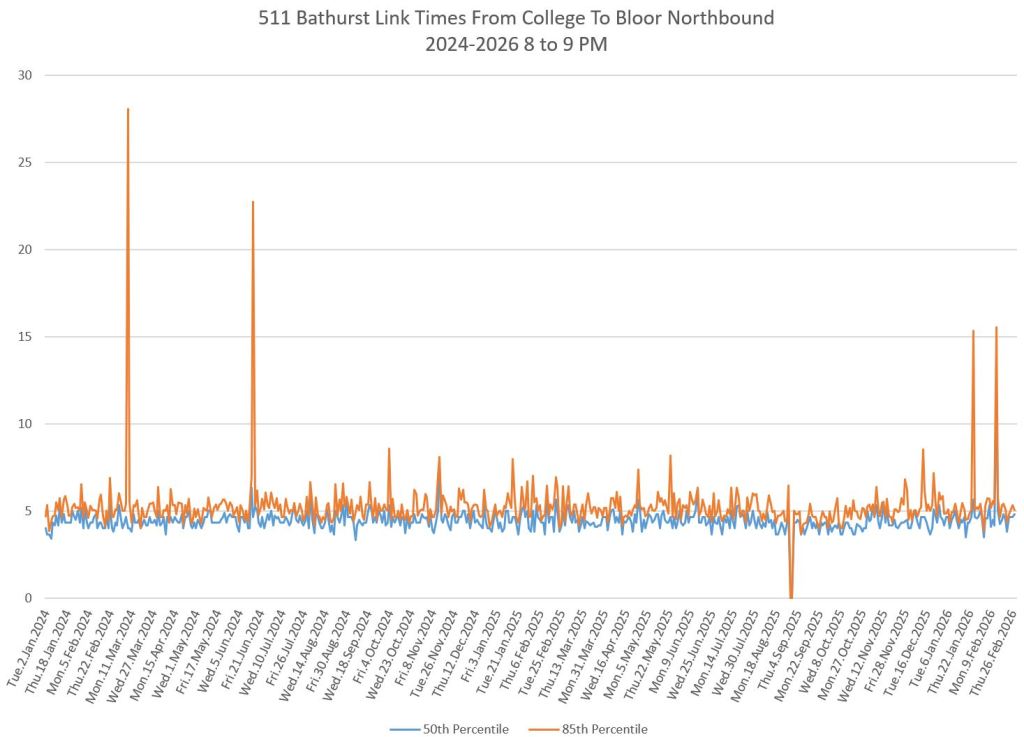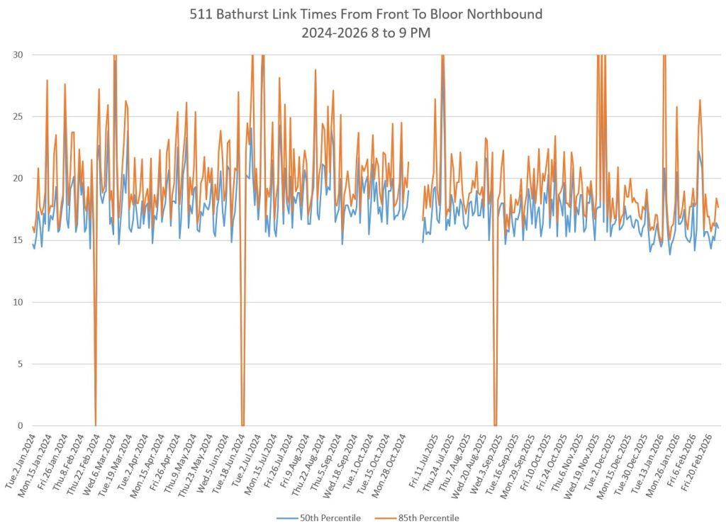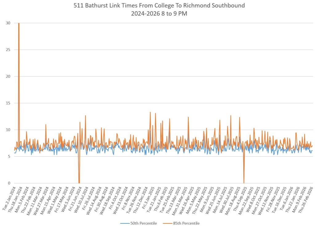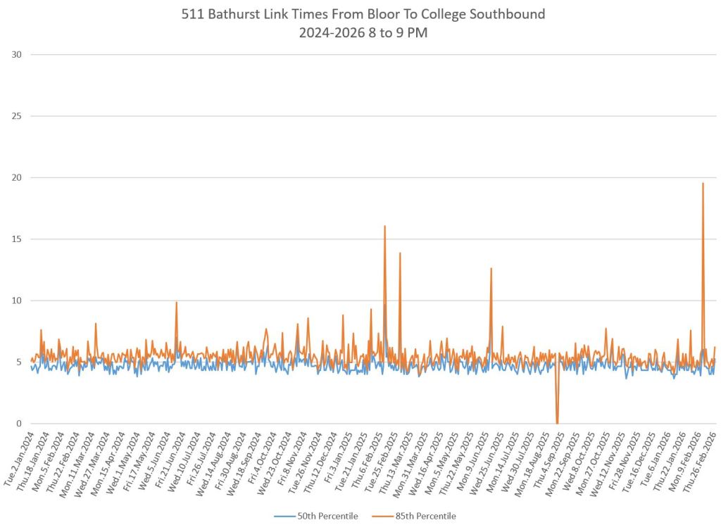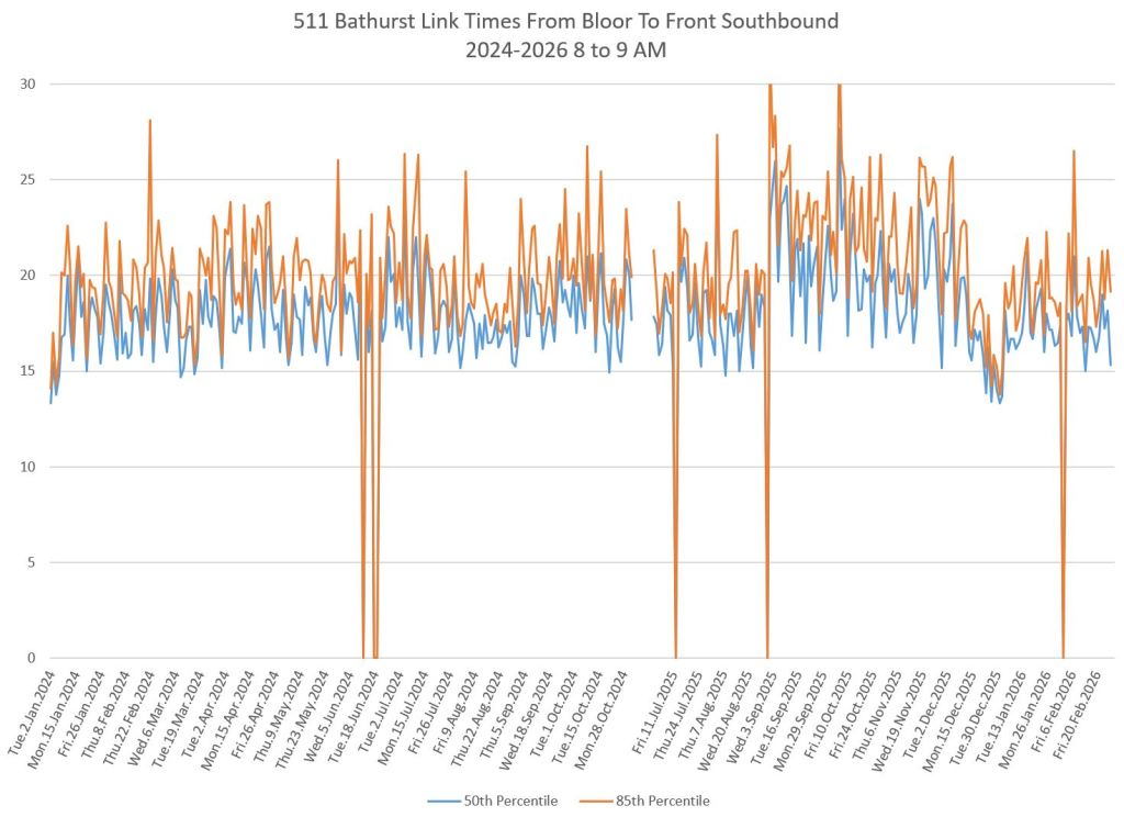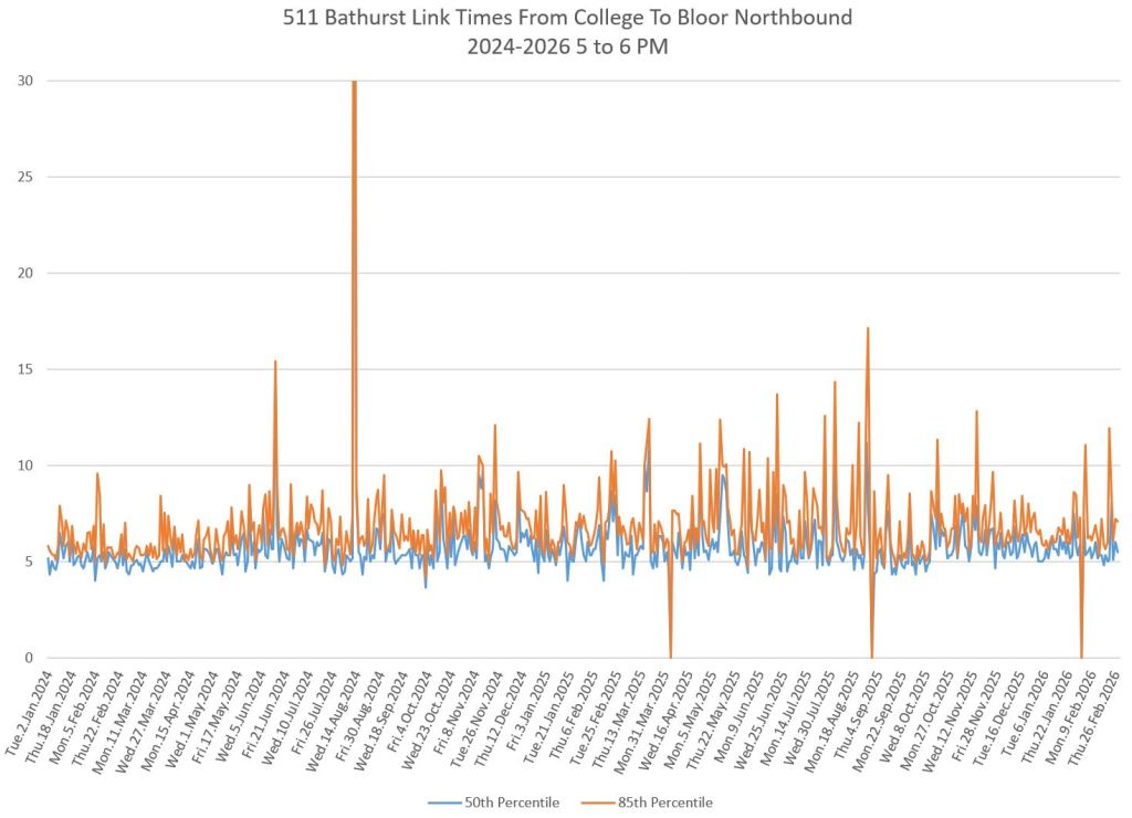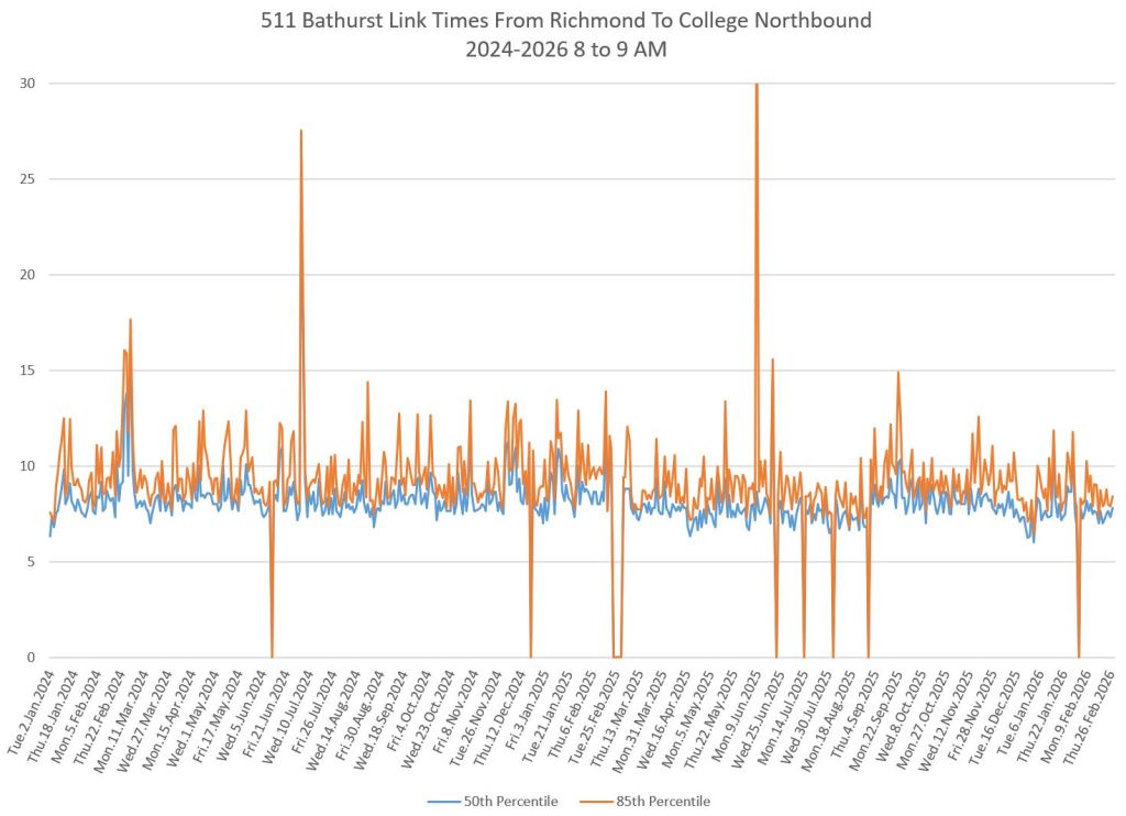 The first part of this article reviews travel times over various parts of the route from January 2024 to February 2026. Between November 2024 and June 2025, the south end of the streetcar route was diverted for construction. Data for this period is included in the charts only for locations north of King which had streetcar service through the entire 2+ year period.