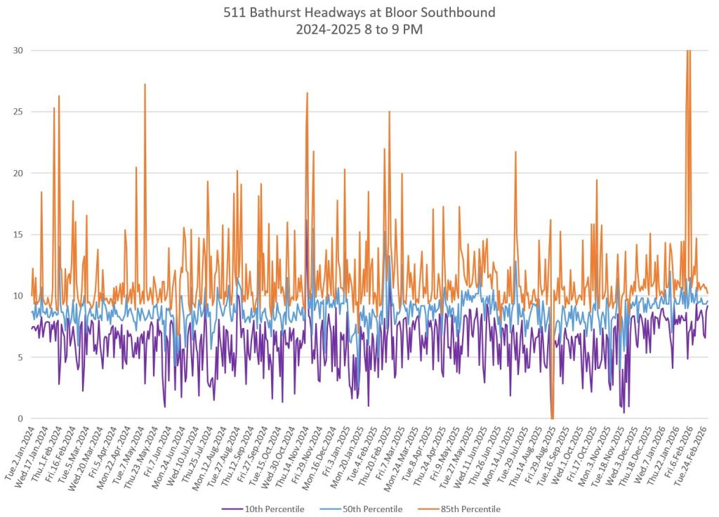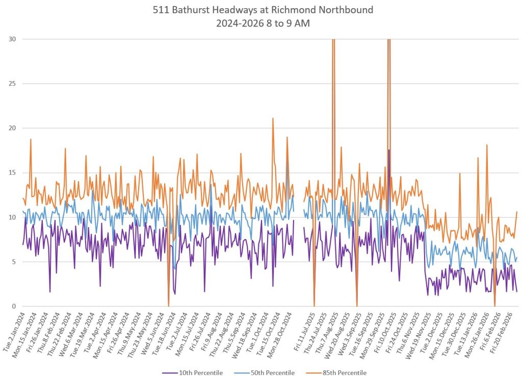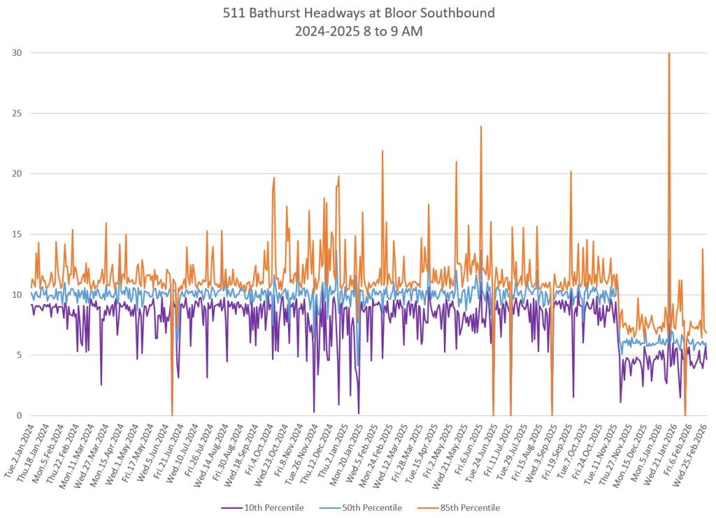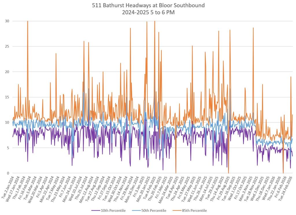 The charts below show the headways measured crossing Bloor Street southbound. Note that the scheduled service improved to every 6 minutes in November 2025 during the peaks and midday. The stats fall to a lower level at that point.