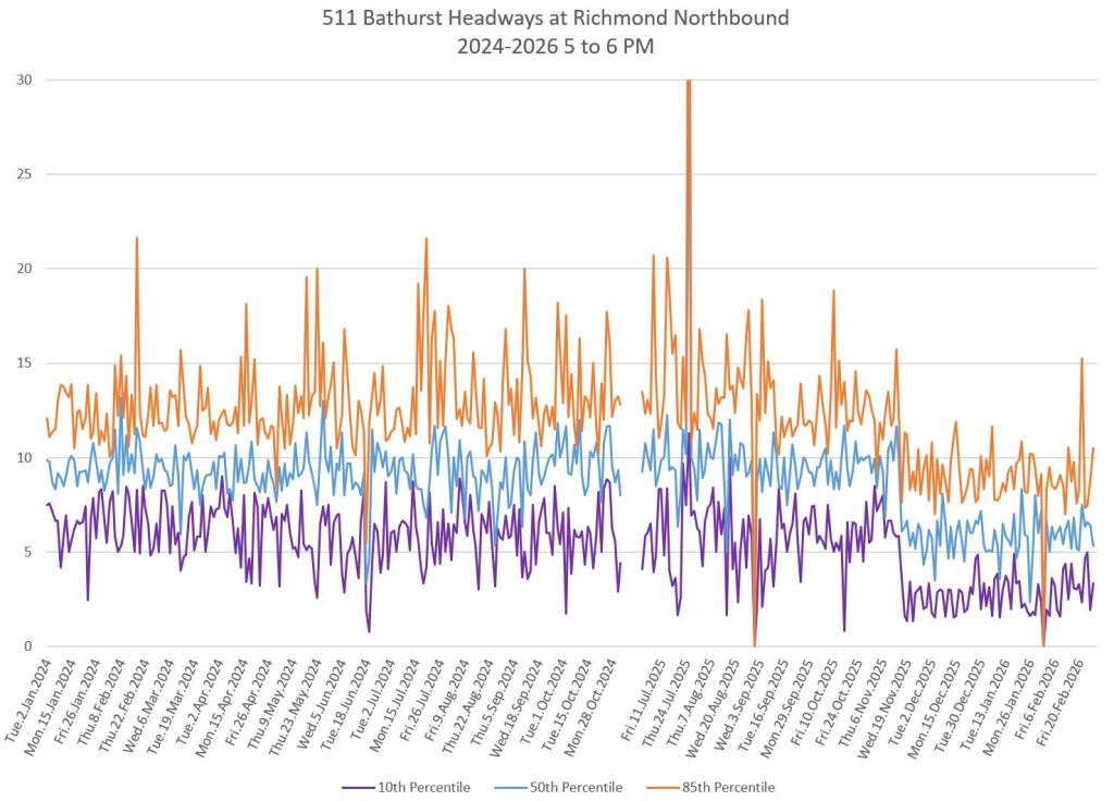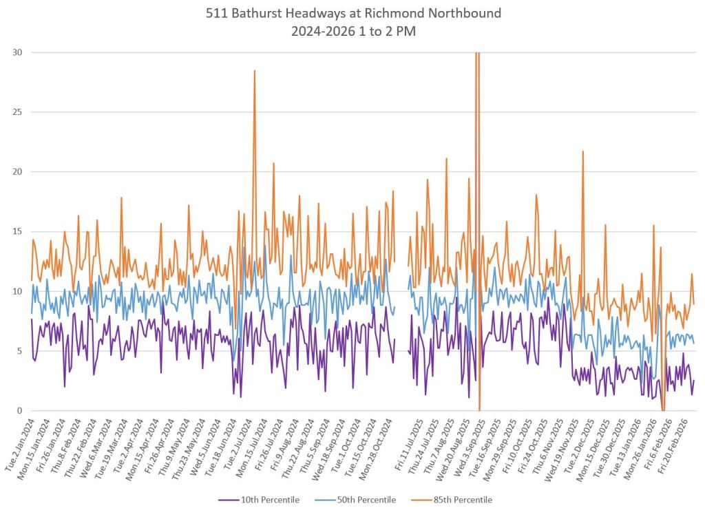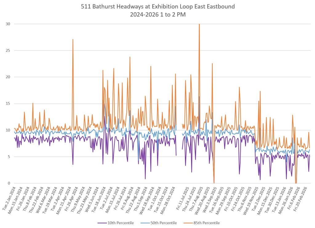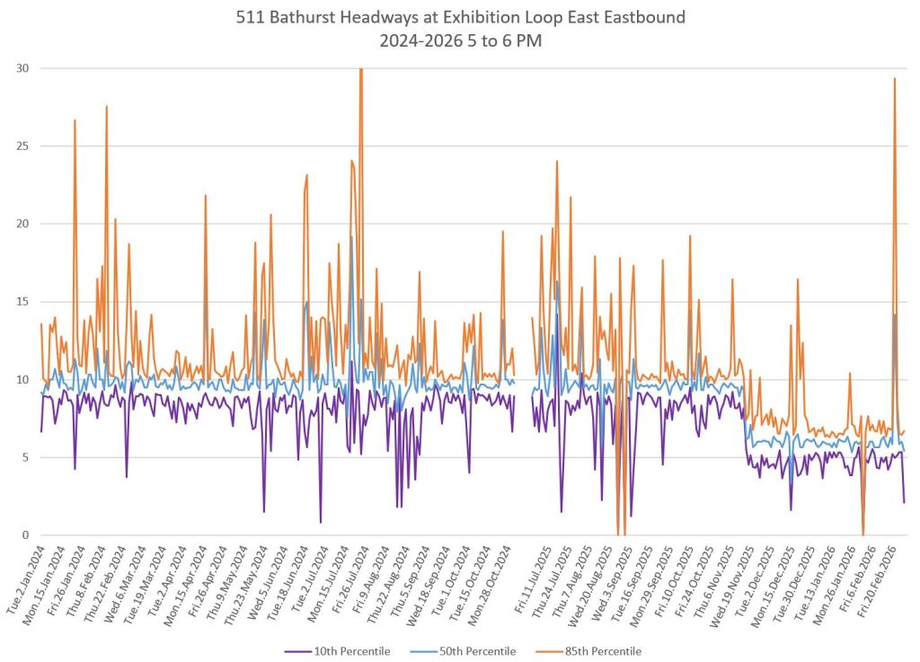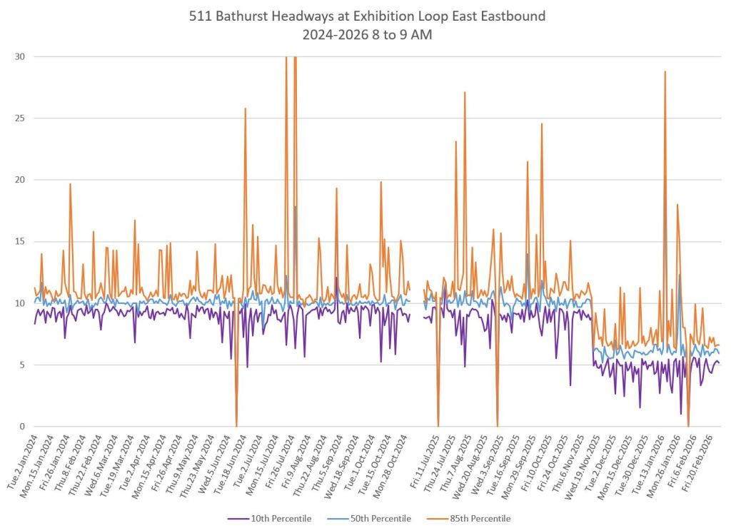 The charts below show the headways measured crossing Bloor Street southbound. Note that the scheduled service improved to every 6 minutes in November 2025 during the peaks and midday. The stats fall to a lower level at that point.
