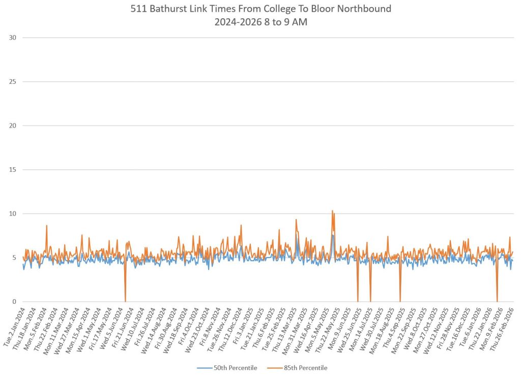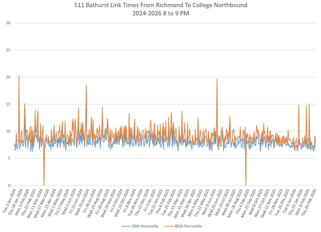 Between College and Bloor, the reserved lanes have not yet been installed. Travel times are quite consistent during most periods, but vary by time of day and direction.