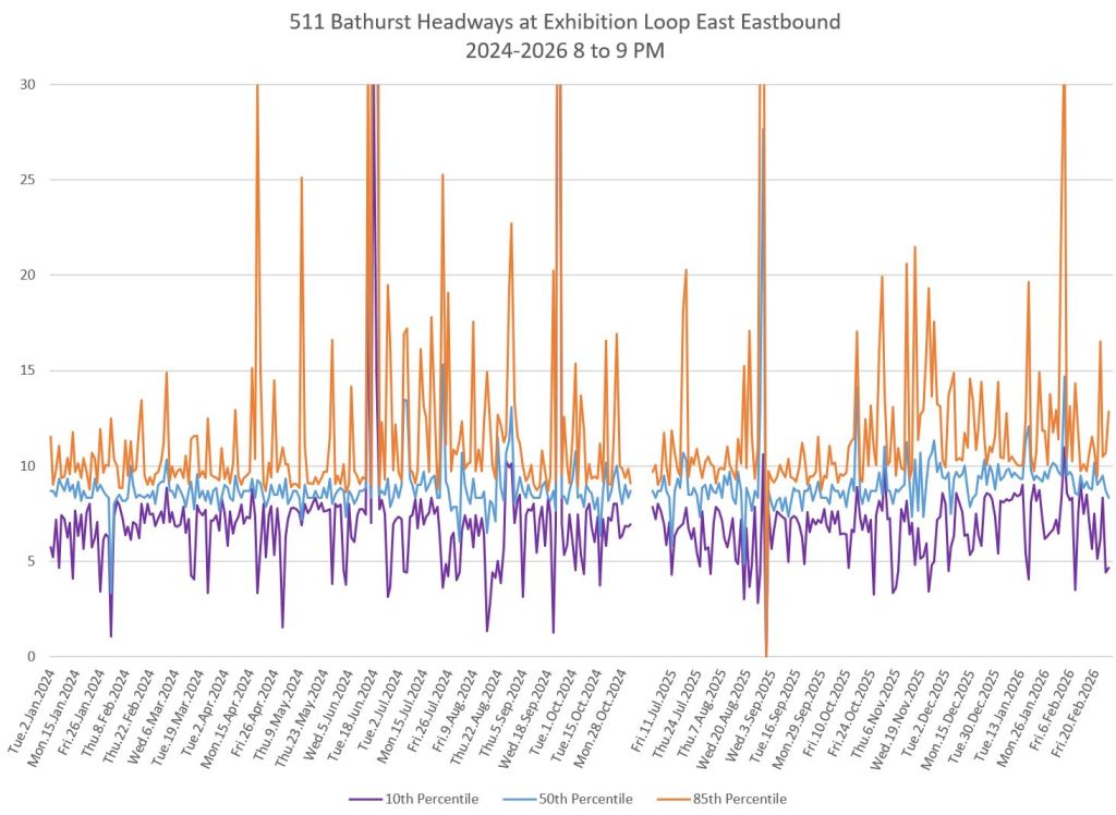 The charts here show headways leaving Exhibition Loop eastbound (left) and the corresponding time periods northbound at Richmond (right). Note that in this comparatively small distance, the spread in values grows substantially showing that closely spaced departures from the terminal do not last long. Even with a six minute scheduled headway and reserved lanes over much of the distance, the data from November 2025 onward show that service is much less reliable at Richmond than it was leaving Exhibition.